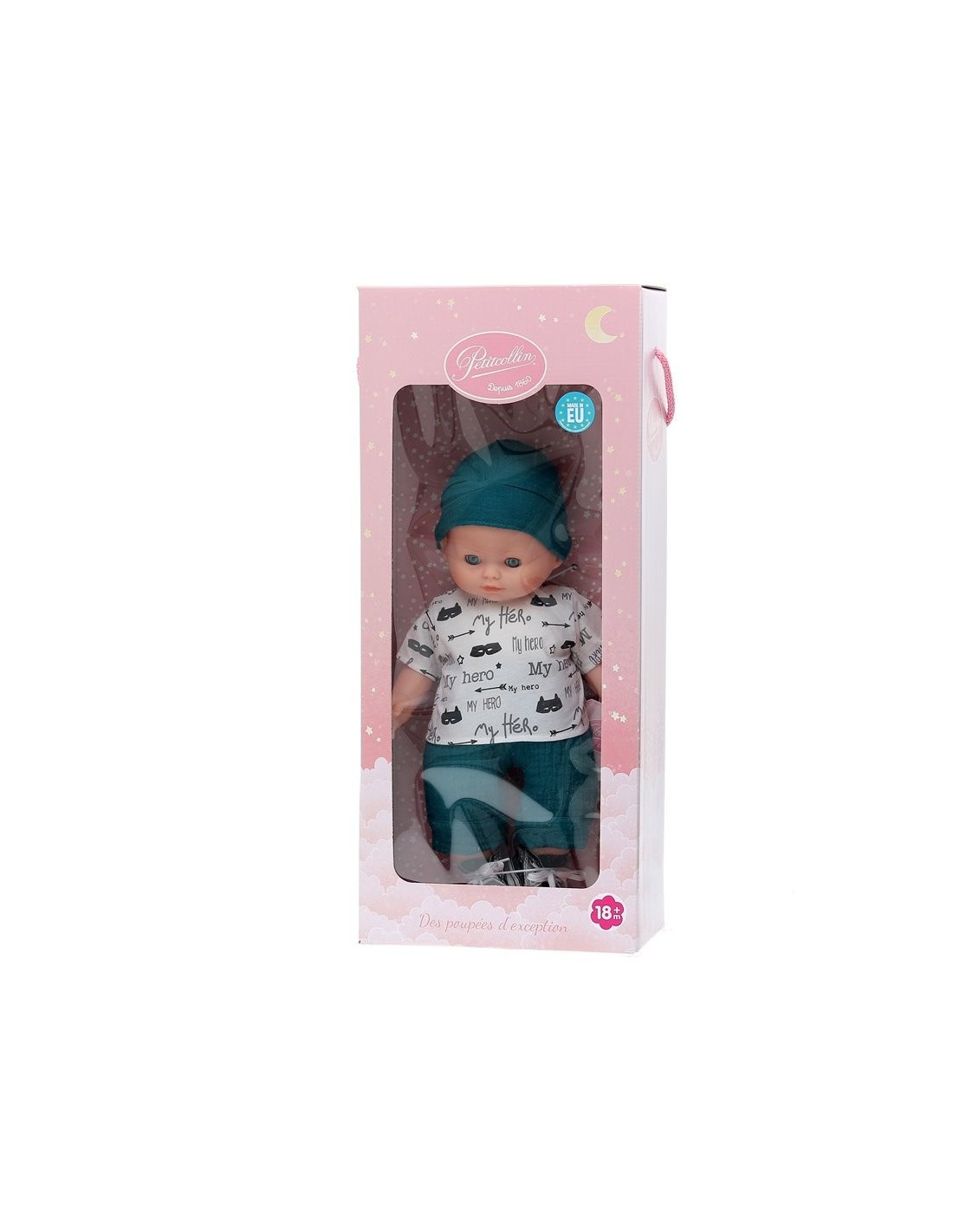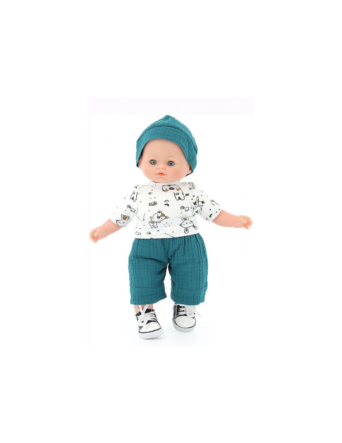 Petit Câlin 36 cm avec habillage "Marius". Tête, bras et jambes en vinyle souple au délicat parfum de vanille. Corps en tissu. Yeux dormeurs bleus. Cheveux peints blonds. Fabriquée en Europe. La tenue se compose d'un maillot et d'un pantalon, d'un bonnet et d'une paire de baskets. Photos non-contractuelles