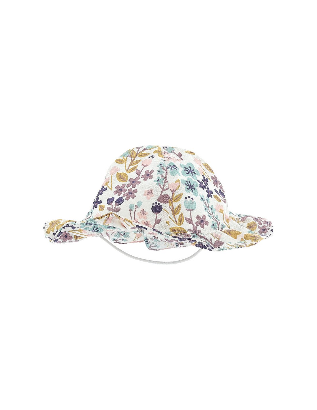 La tenue se compose d'une jupe rose et d'une blouse aux motifs fleuries et d'un chapeau aux motifs fleuris.