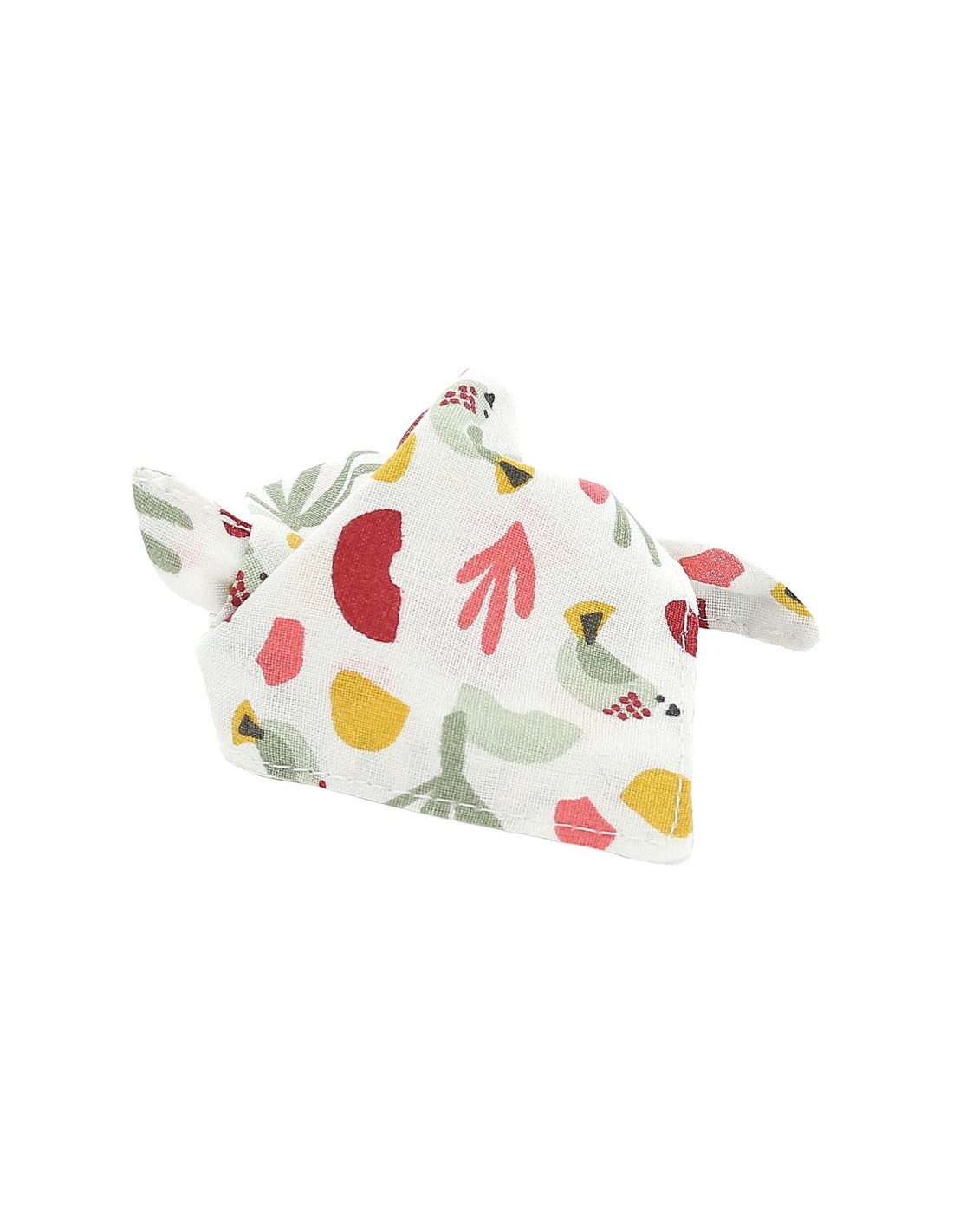 La tenue se compose d'un pantalon gris, d'un gilet violet, d'un foulard fleuri et d'un bonnet en jean avec oreilles.