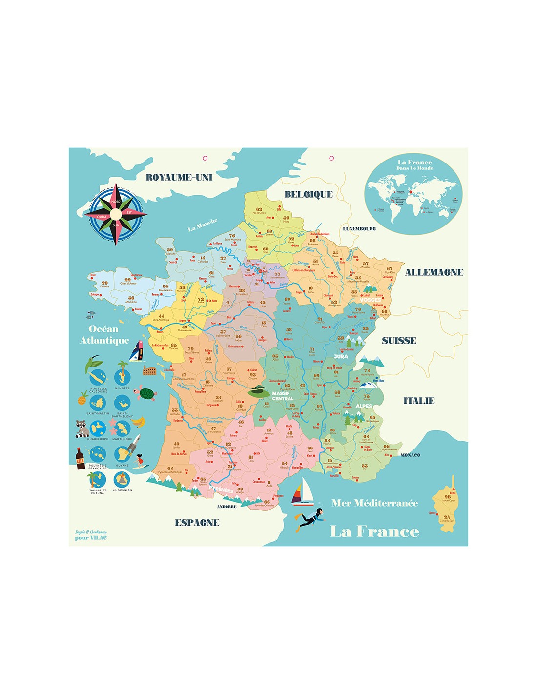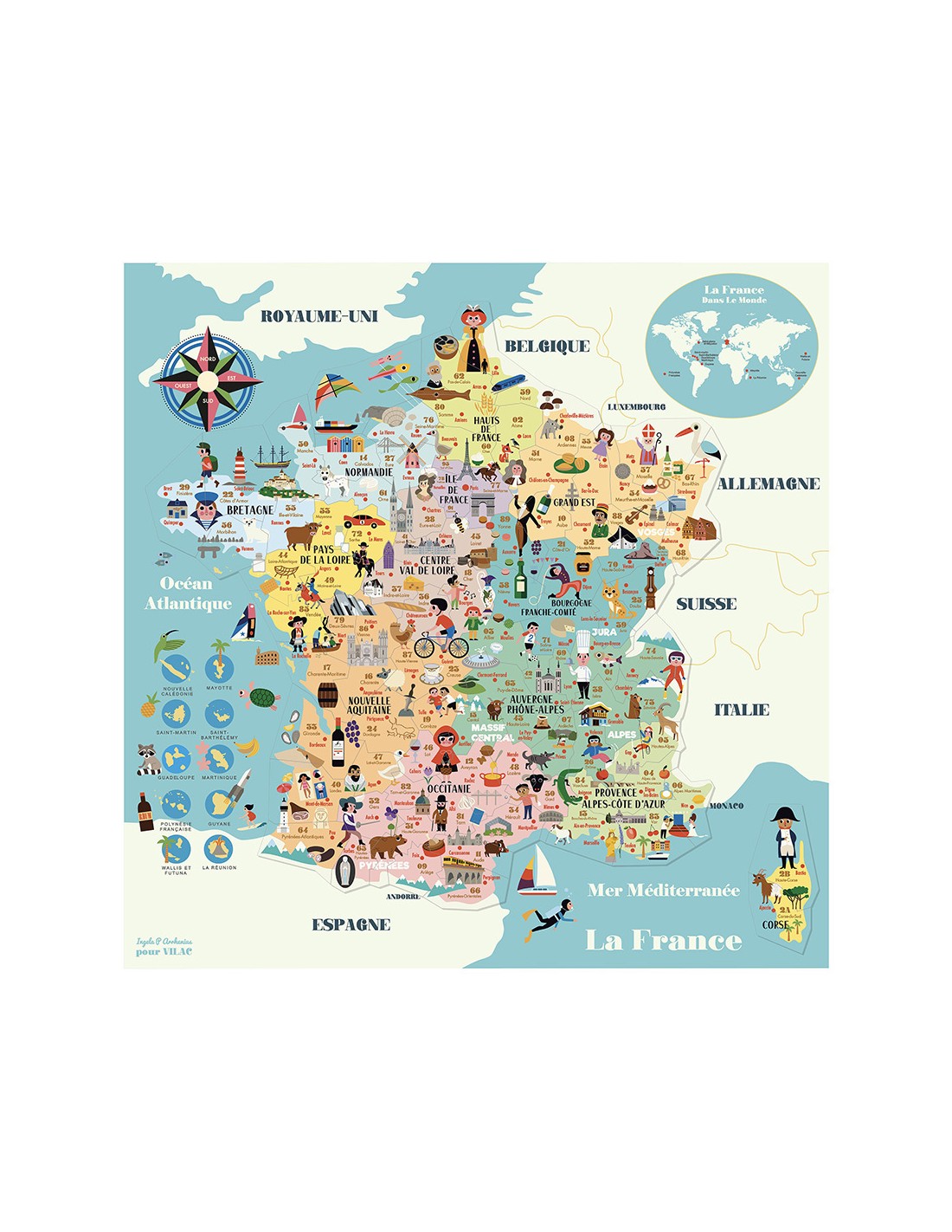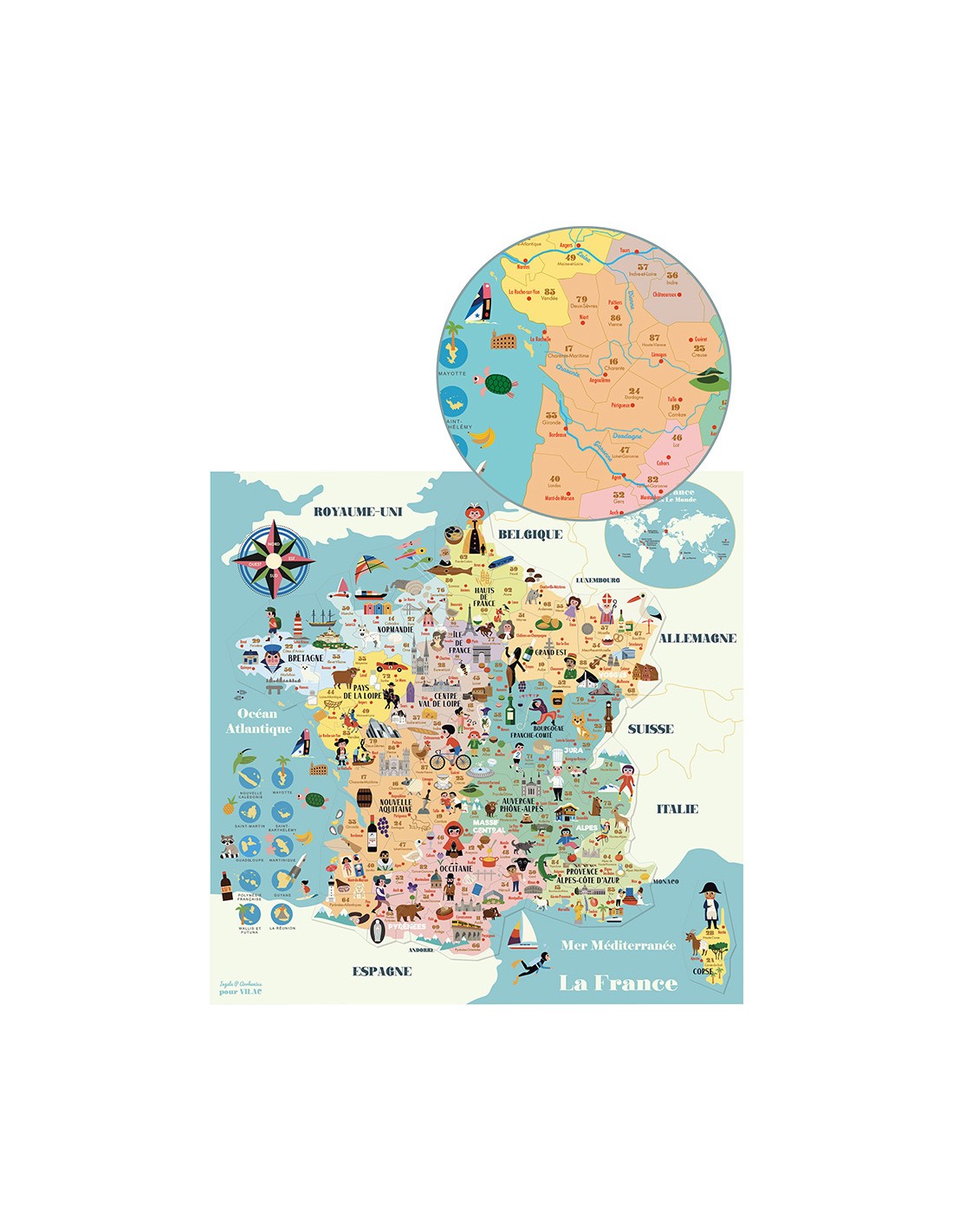 Une carte de France magnétique de 92 pcs en bois illustrée par Ingela P. Arrhenius pour découvrir les régions, départements, villes, spécialités etc en s'amusant !
