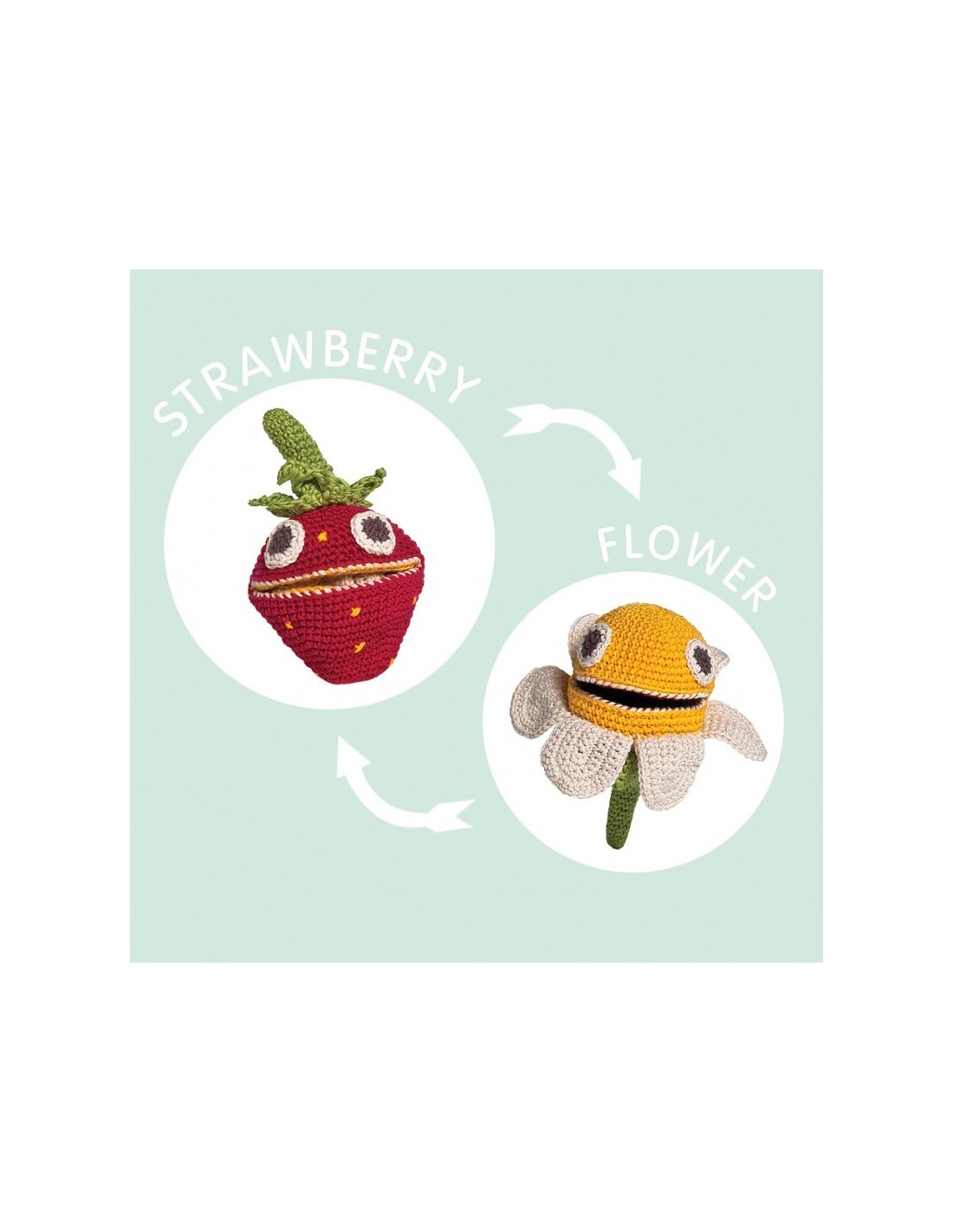 Ce jouet est réversible. En forme de fleur, il se transforme en fraise. Ainsi l'enfant apprend qu'avant la fraise, Mère Nature produit une petite fleur.
