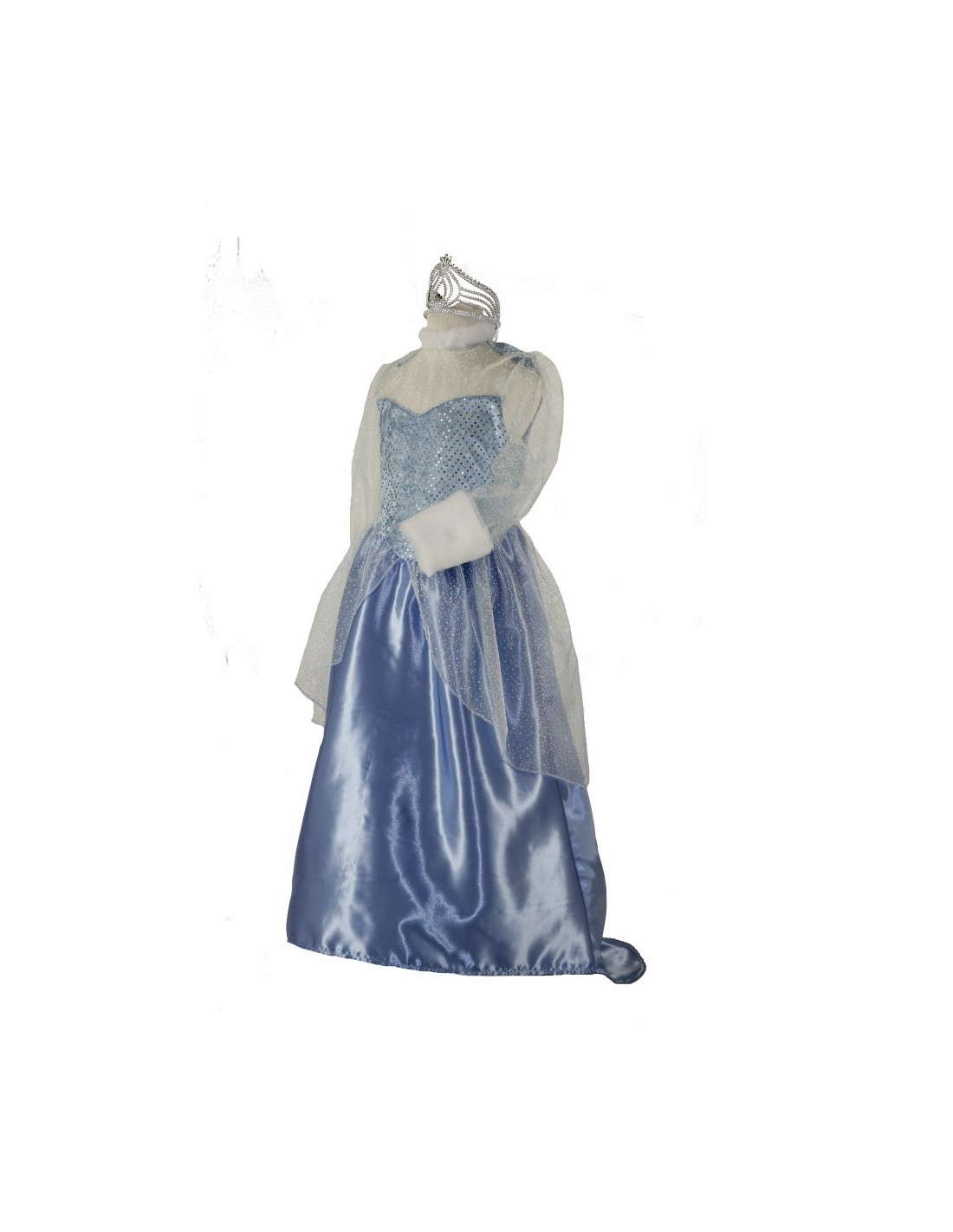 Déguisement Fabriqué en France. Tissus en satin polyester bleu ciel, organza bleu ciel et bas de manche en fourrure synthétique.