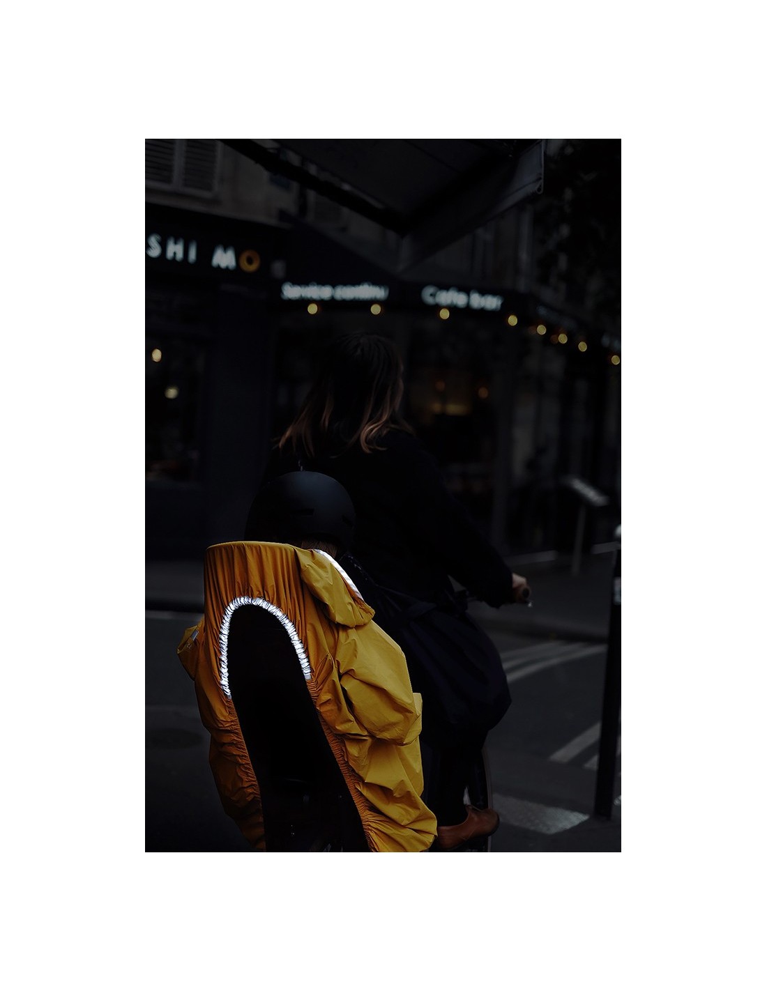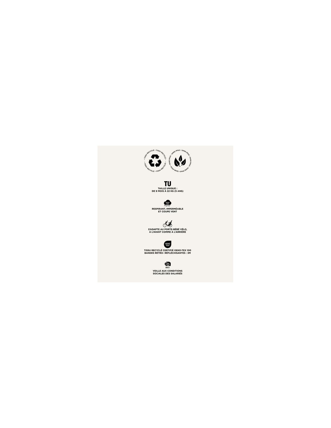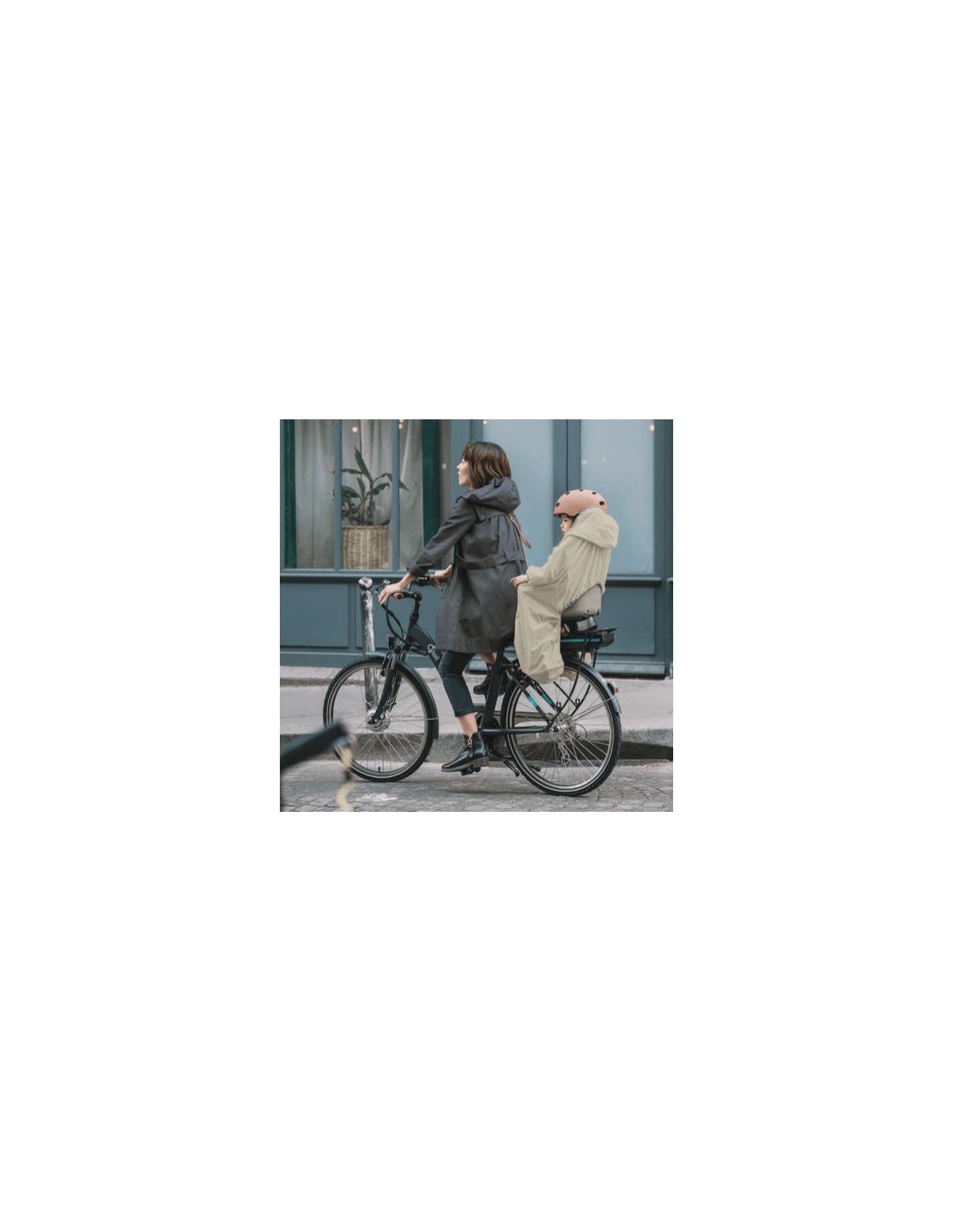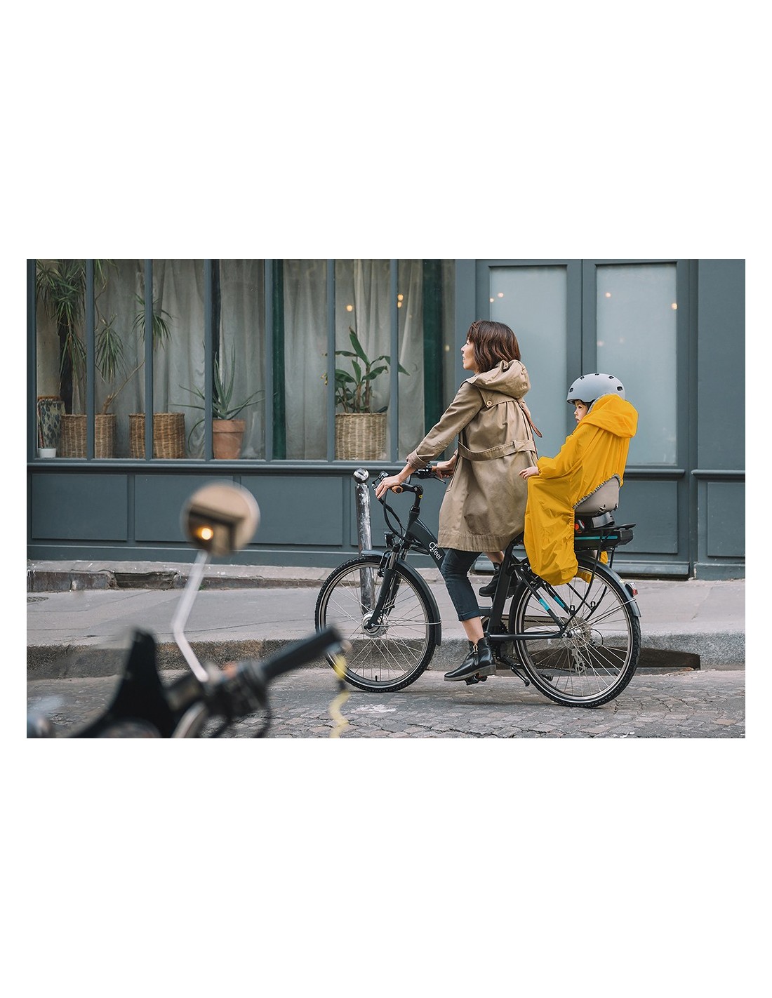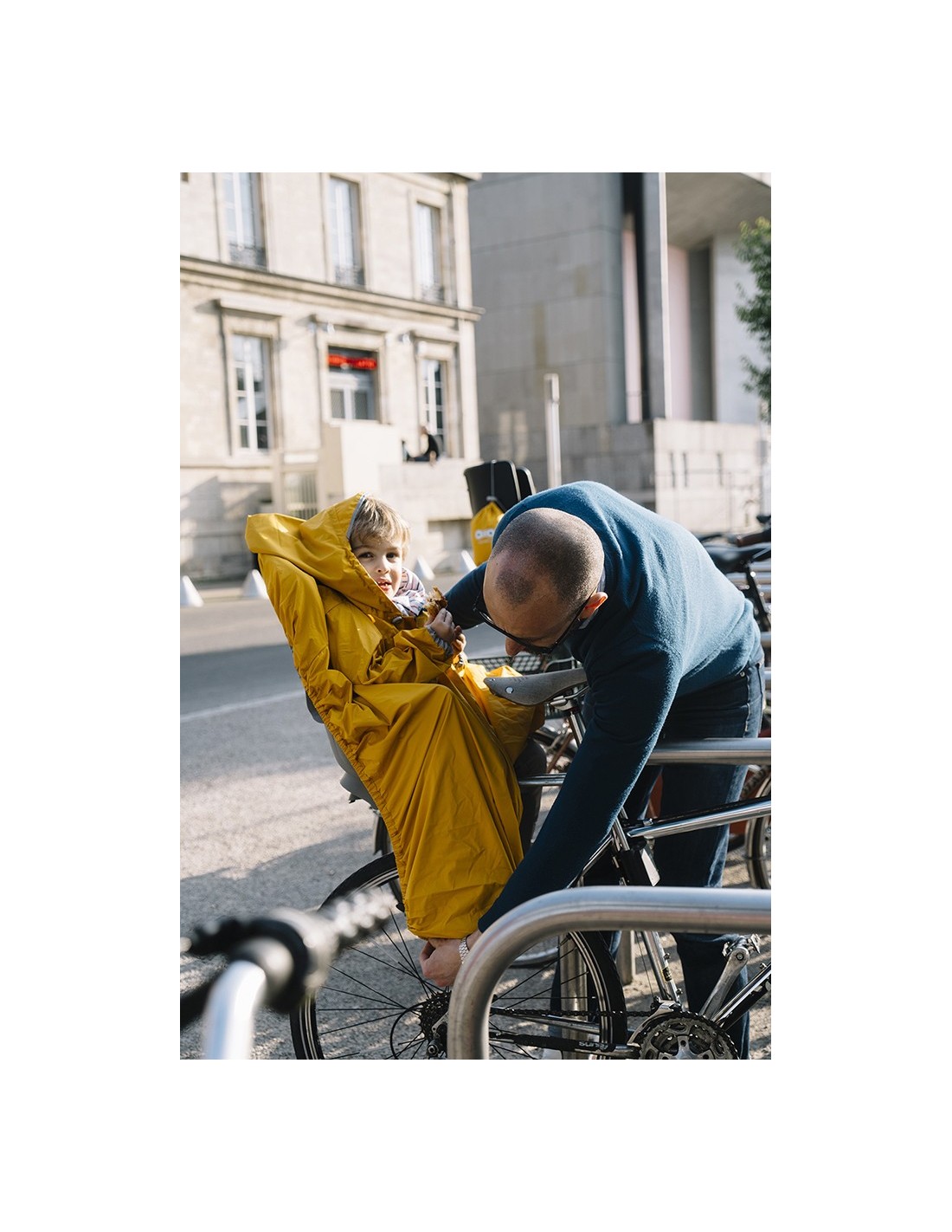 Votre cape de pluie s'adapte au porte-bébé de votre vélo, à l'avant comme à l'arrière, à l’aide d'un élastique qui entoure le siège.