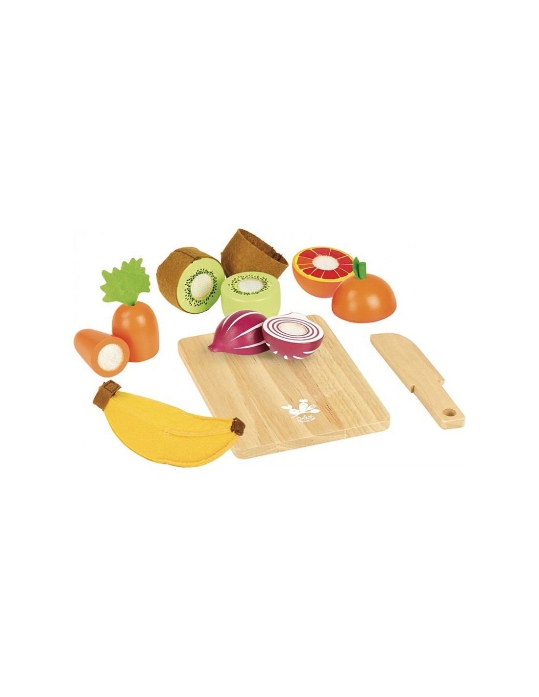 Un panier de 5 fruits et légumes en bois à découper, livré avec une planche à découper et son couteau. A partir de 3 ans.