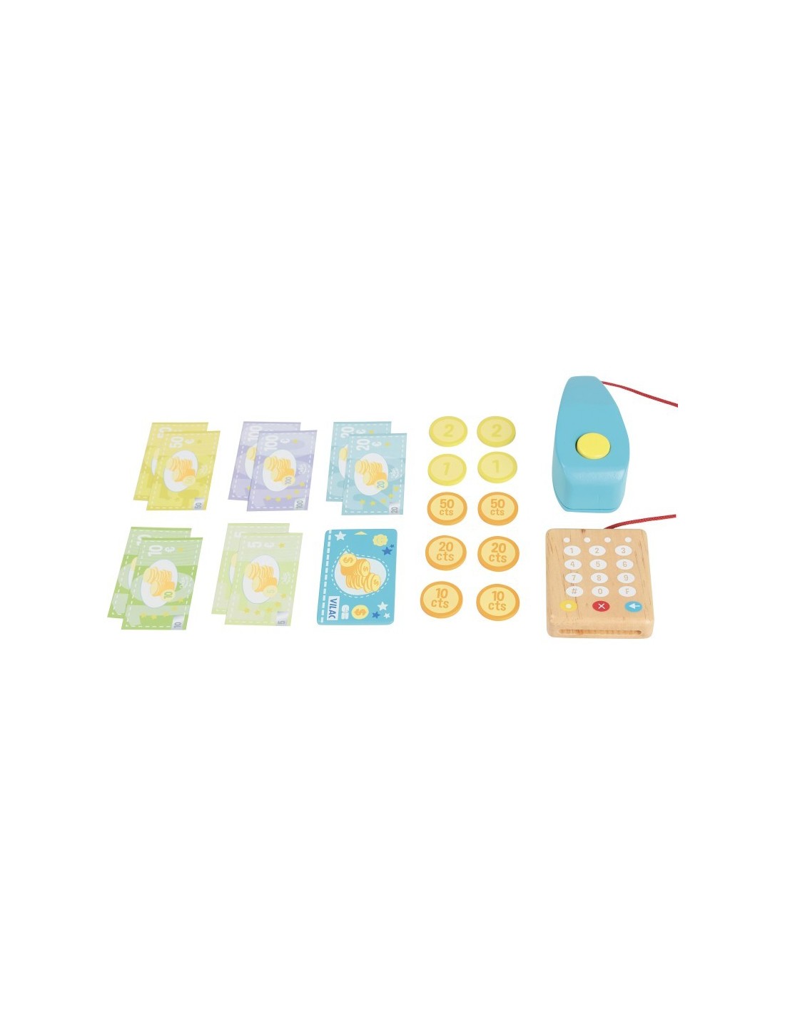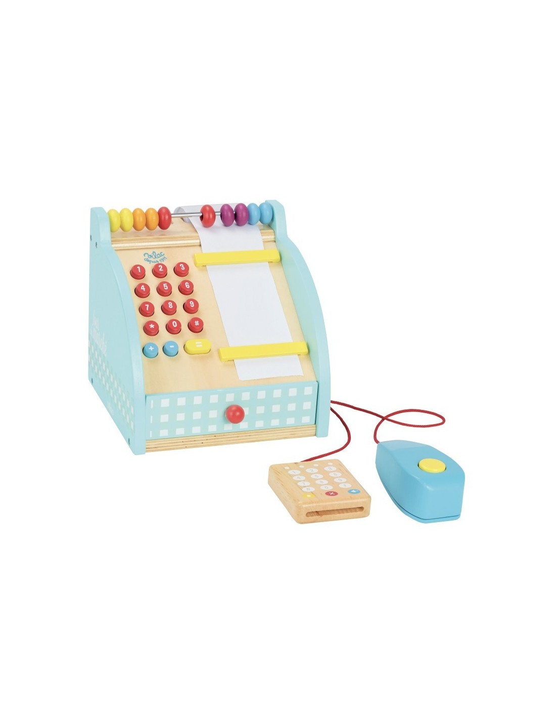 Une caisse enregistreuse en bois avec un tiroir caisse et une douchette sonore, des pièces et billets et une carte de crédit pour faire comme au supermarché pendant des heures et des heures.