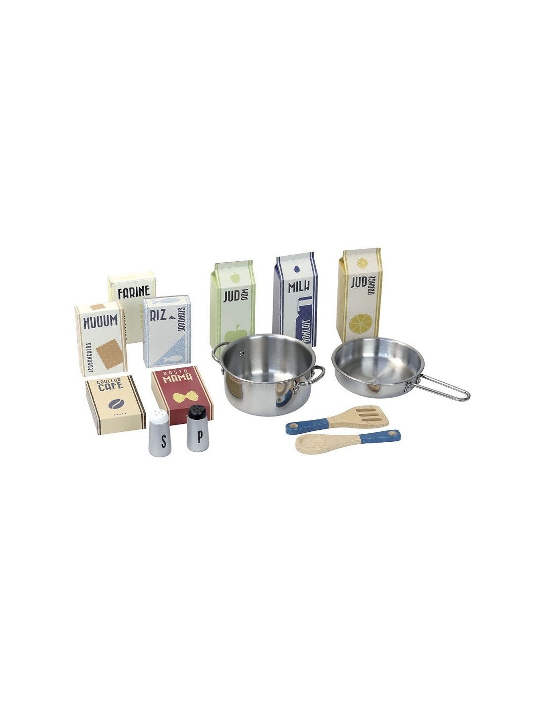 Devient un top-cuistot ! Jolie cuisine en bois pour enfant - modèle Cuistot - coloris jaune moutarde - Livré avec 14 accessoires : 1 salière et 1 poivrière sonores en bois, 1 spatule et 1 cuillère en bois, 1 faitout et 1 poelle en métal, 8 mini pack en carton. Bruitage sonore des boutons. À monter soi-même. À partir de 3 ans.
