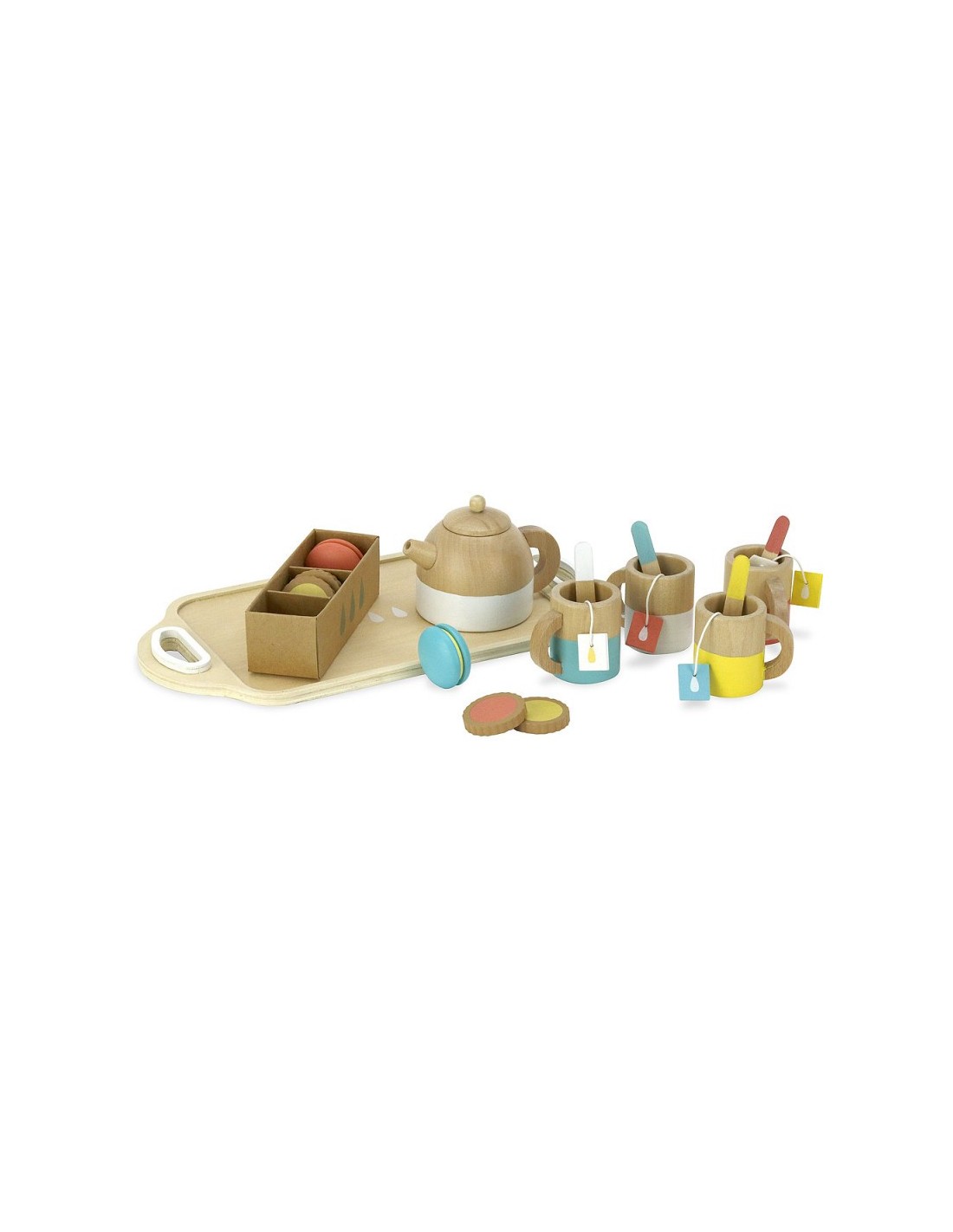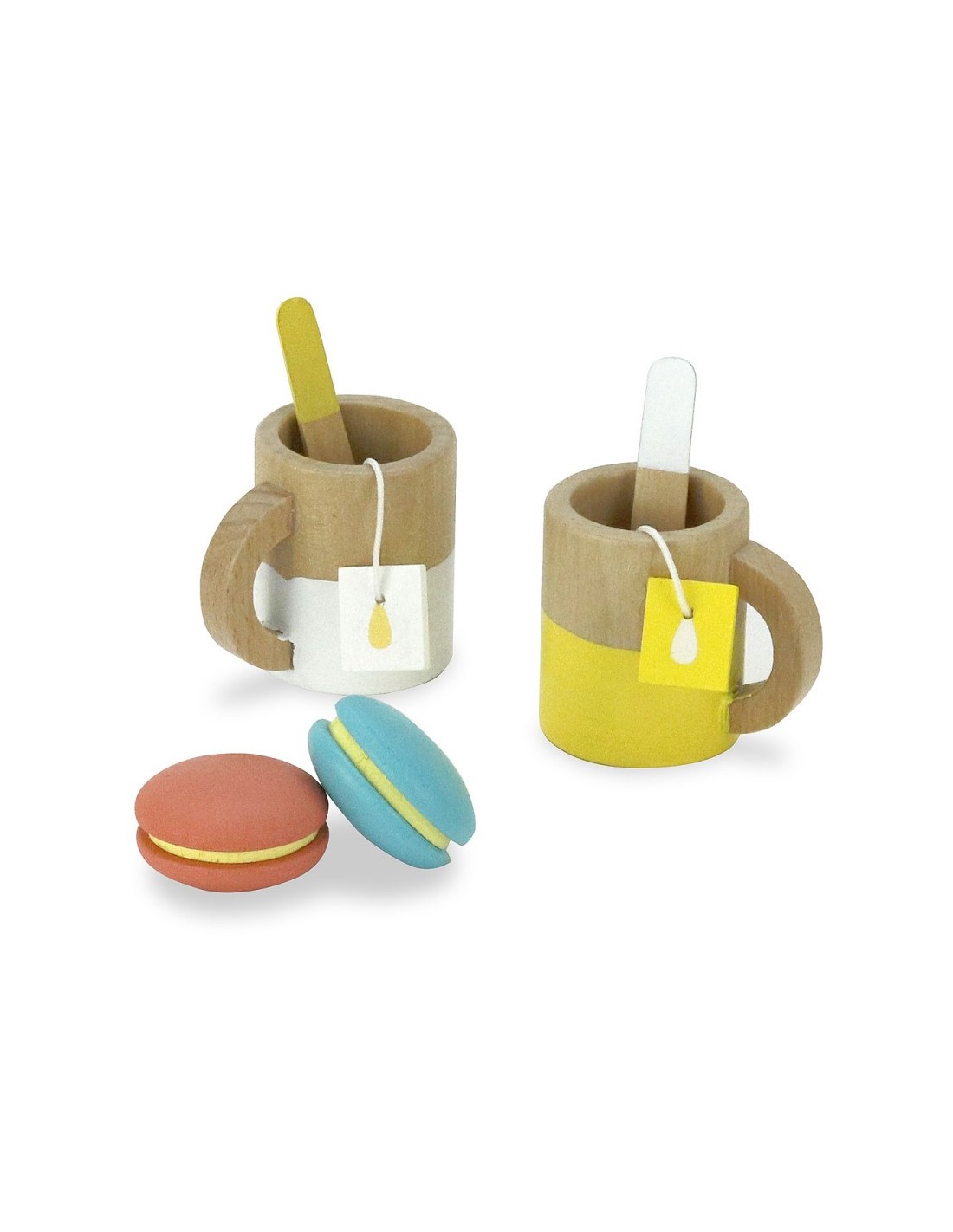 Tea Time ! Les enfants adoreront inviter leurs doudous à jouer avec ce joli service à thé en bois aux couleurs douces. Voulez-vous un sablés fraise lapinou ? Et toi petite poupée, aimerais-tu un macaron à trempouiller dans ton thé ? Touille touille le sachet, hummmm la bonne odeur de ce gouter ! Contenu : 4 tasses, 4 cuillères, 1 théière, 4 sachets de thé, 2 macarons, 4 sablés dans leur boite, 1 plateau.
