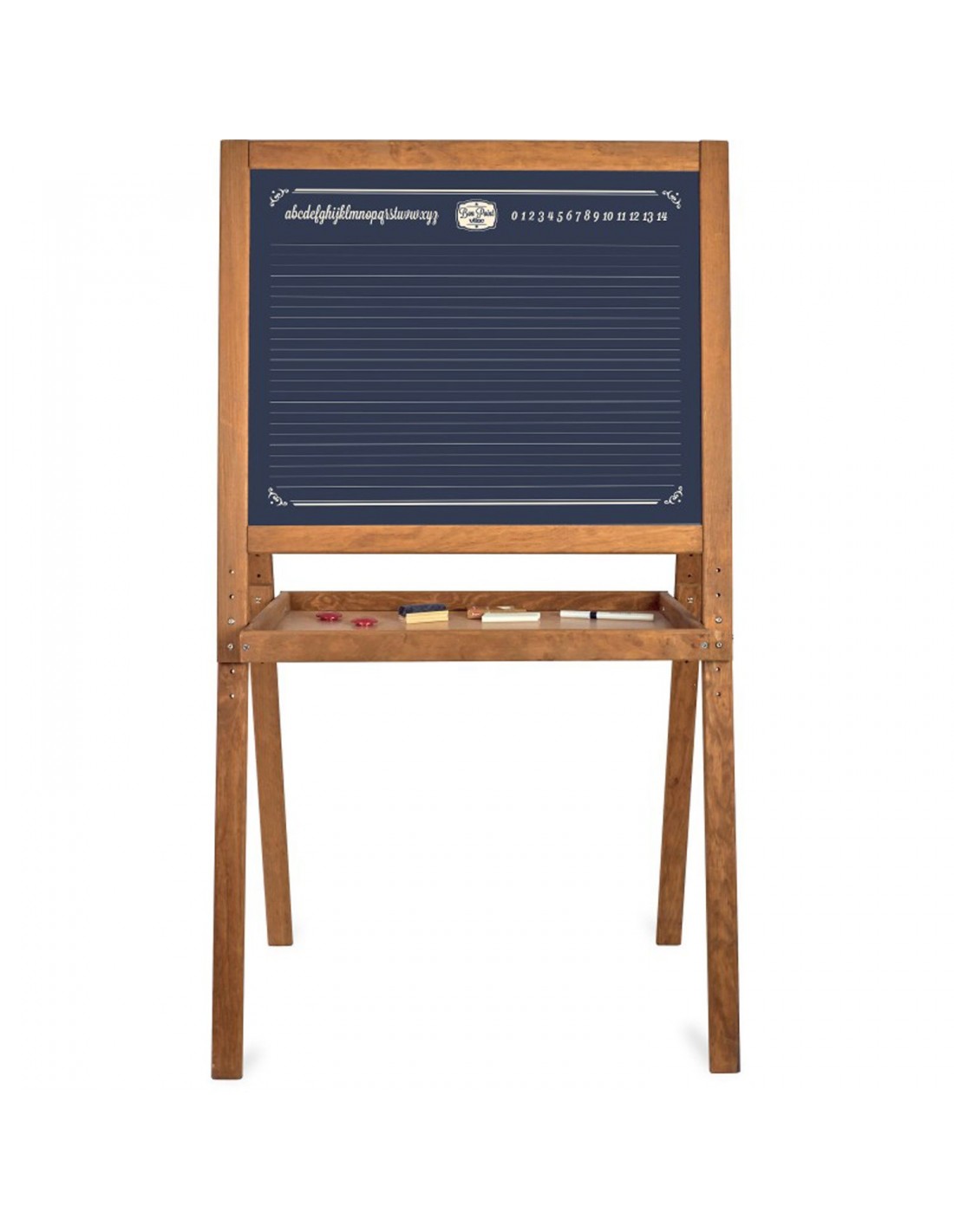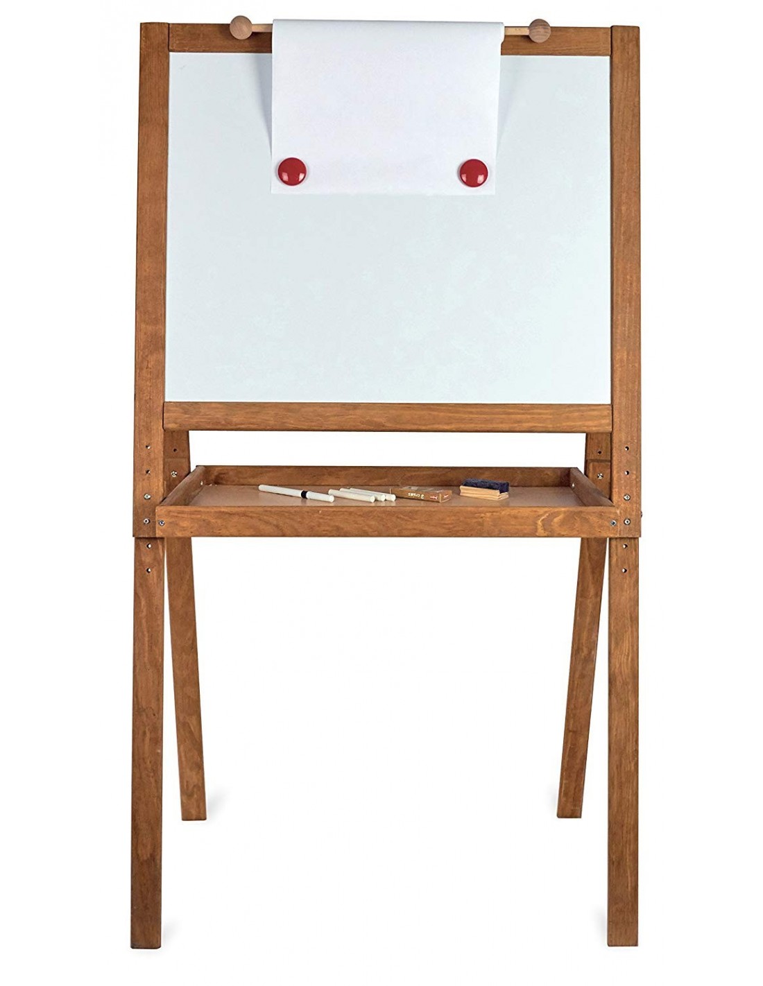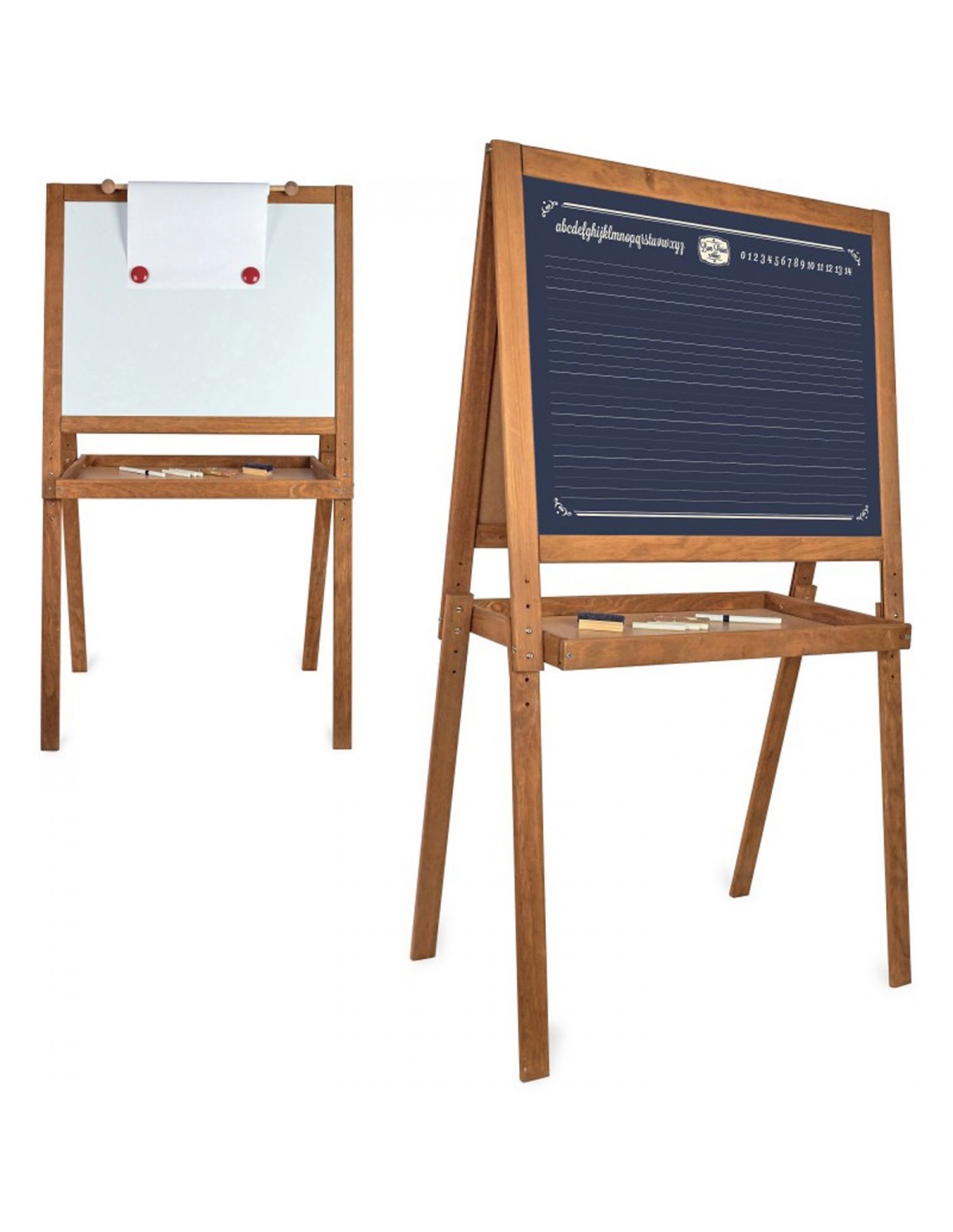 Un grand tableau en bois sur pied avec une face pour écrire à la craie sur les lignes et une autre face blanche magnétique pour feutres et aimants. Ce tableau est doté également d'un rouleau de papier pour dessiner. Livré avec rouleau de papier, magnets, brosse à tableau, craies et feutres.