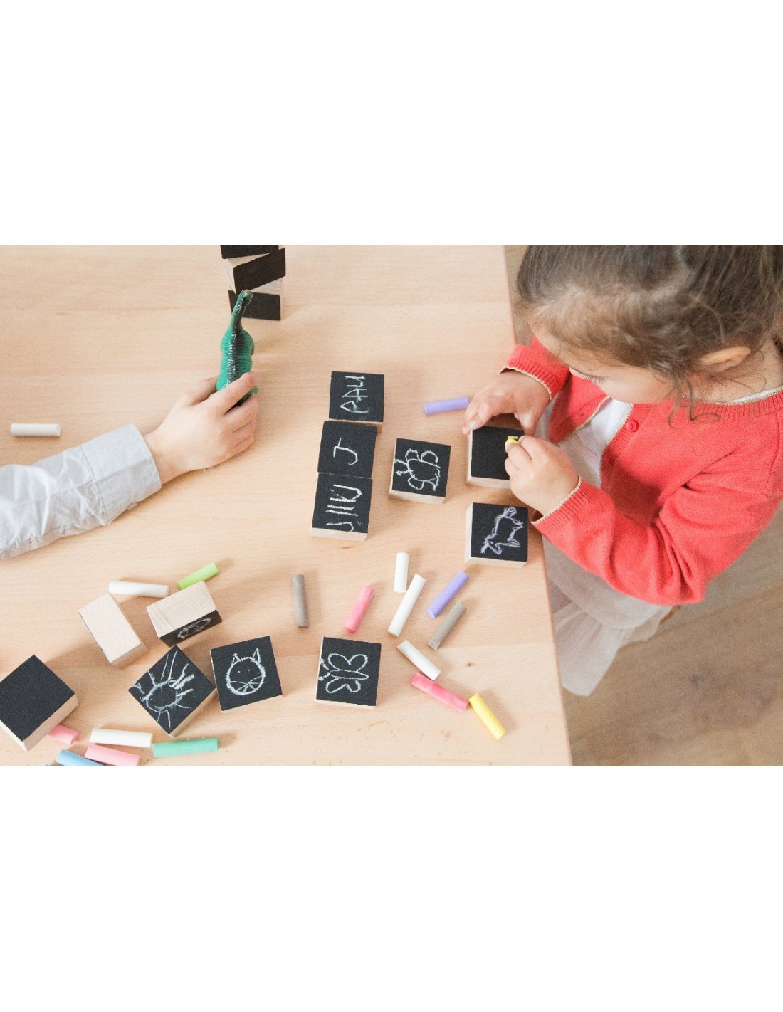 Livré dans son coffret en carton pour ranger facilement les cubes après l’activité. Fourni avec 3 craies.