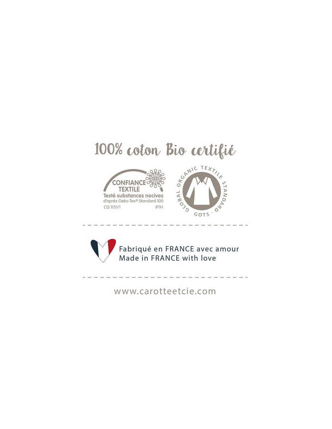 Faits à la main en France, les produits Carotte & Cie ont été imaginés par Alexandra, une jeune maman et styliste dans le monde de l'enfance. Bavoirs, couverture, en passant par le lange et le coussin musical, tous sont fabriqués avec des matières naturelles et douces, toujours en 100% coton, ou avec des matières premières de qualité, bios et/ou imprimés avec des encres à l’eau plus respectueuses de la planète.