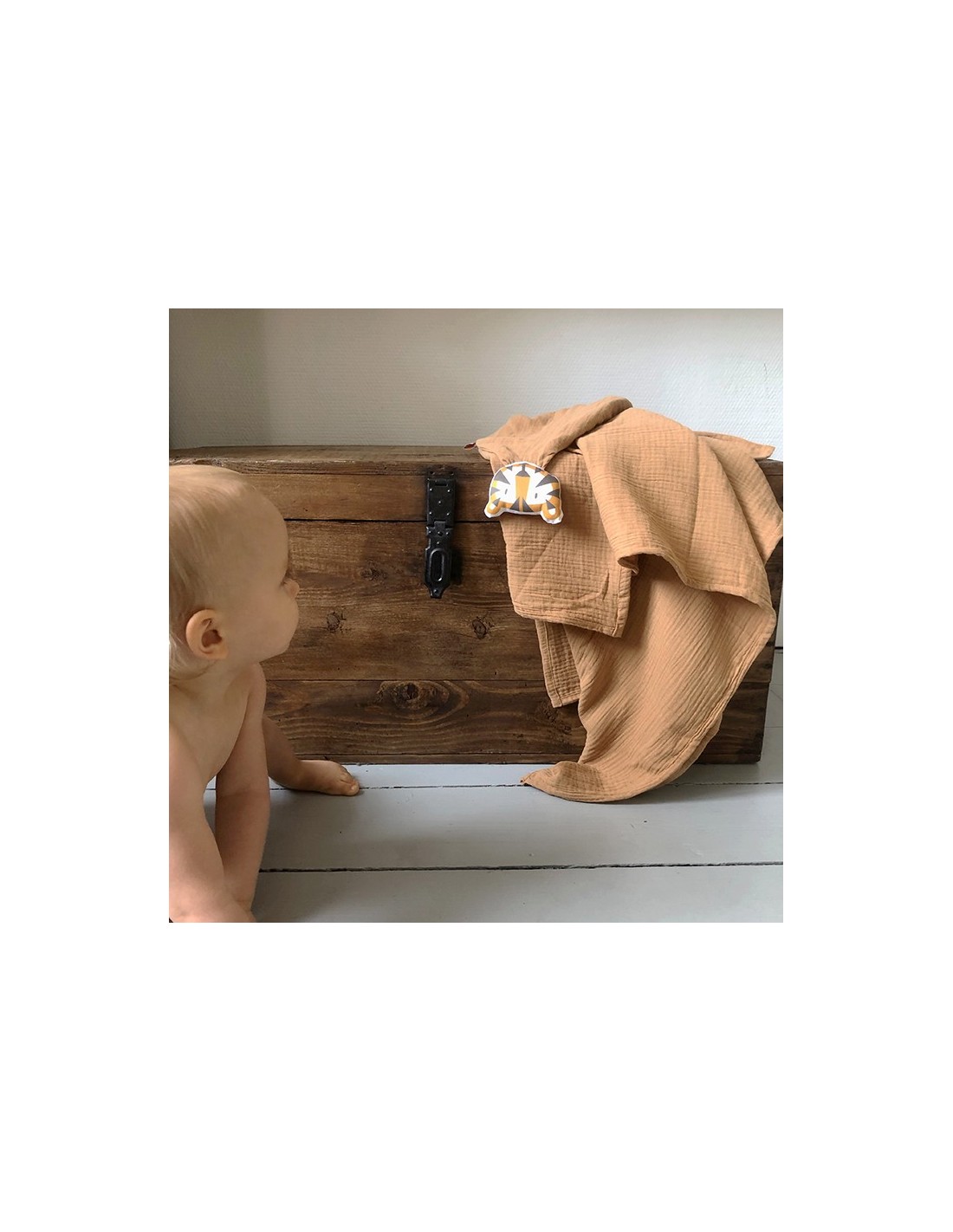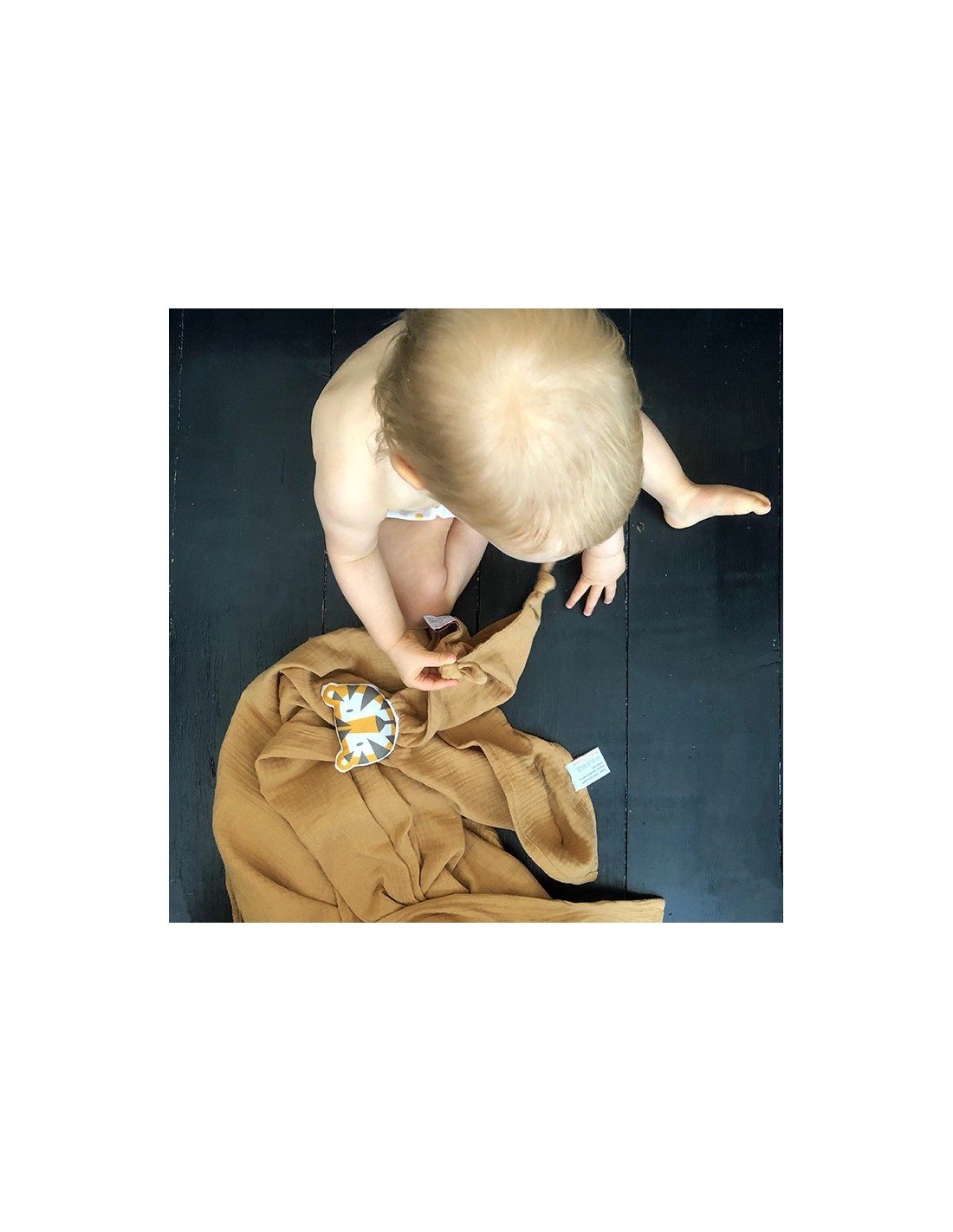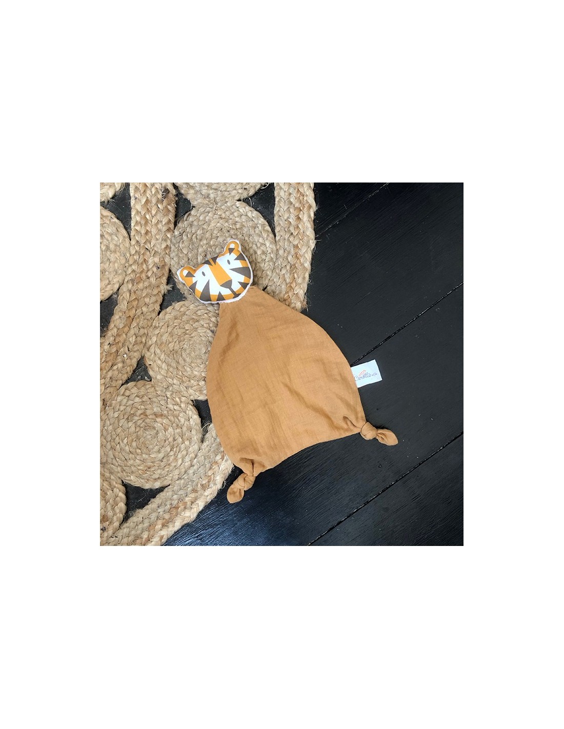 Le doudou Tigre en double gaze de coton camel est facile à prendre en main avec sa petite tête rembourrée et ses deux coins prêts à être mâchouillés par bébé. Véritable ami et confident du quotidien, le doudou accompagnera bébé pour découvrir le monde.