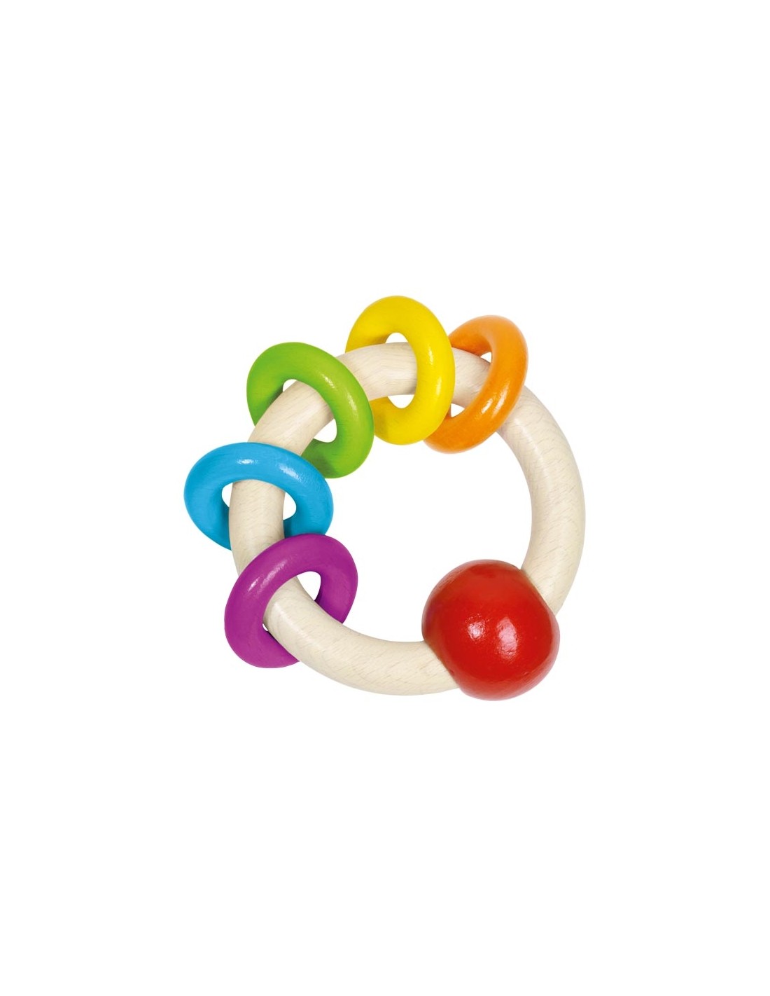 Hochet, 5 anneaux arc-en-ciel en bois.