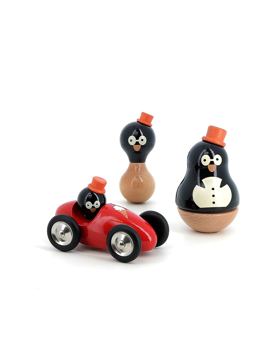Bienvenue René, pingouin malicieux et son chapeau haut de forme, décliné ici en hochet en bois fabriqué dans notre atelier jurassien. « Tchik tchik tchik » fait ce premier instrument de musique, adapté aux plus petites mains.