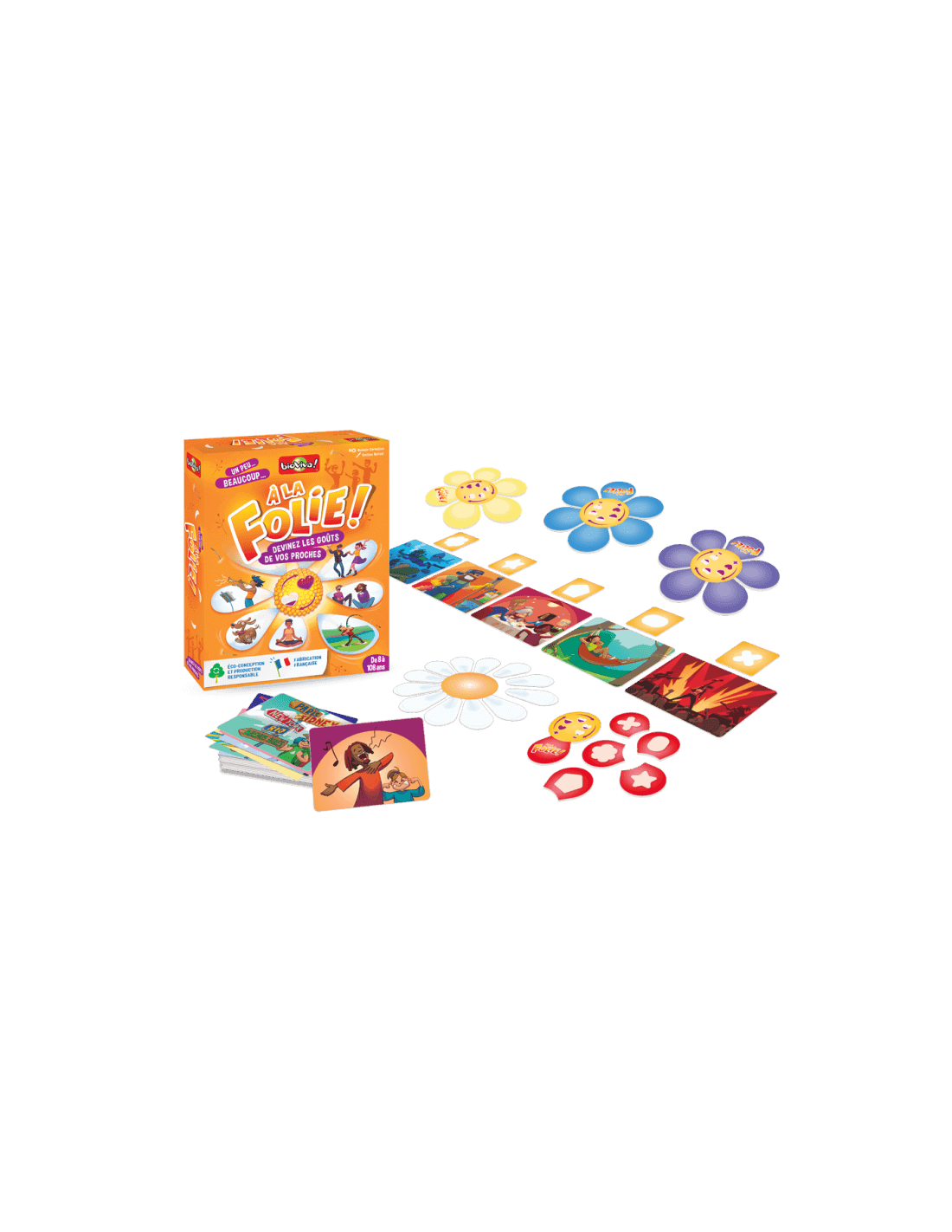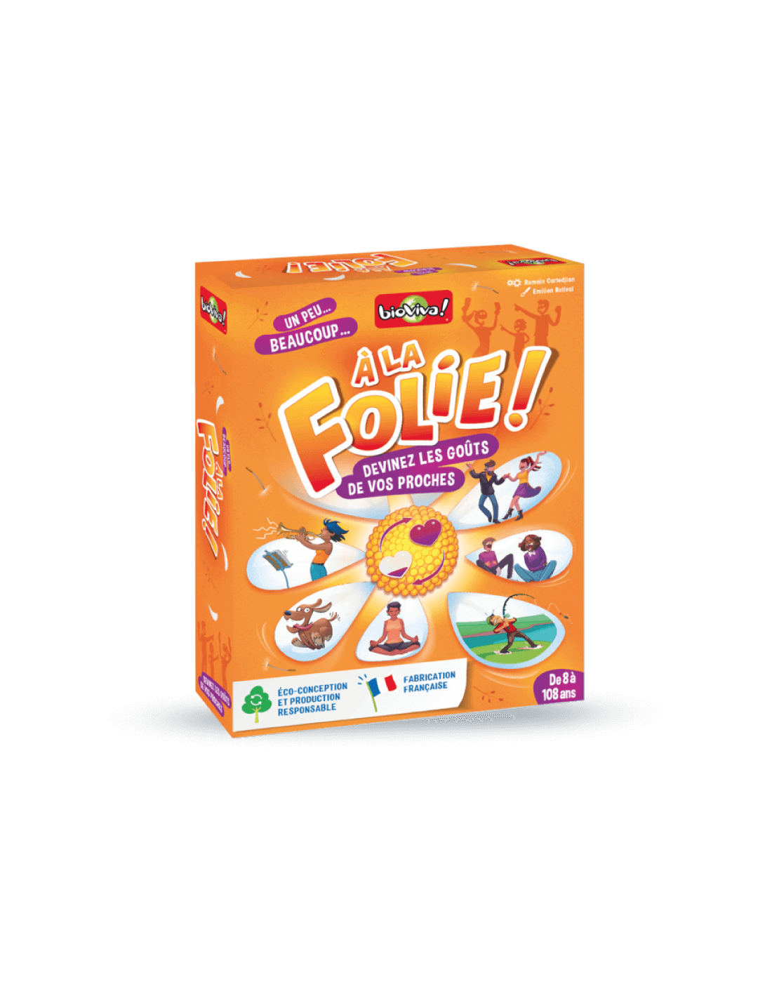 Dans ce jeu coopératif, les joueurs dès 8 ans tentent de deviner les goûts de leurs proches. En famille ou entre amis, au petit-déj’ ou à l’apéro… Dans À la folie, révélez-vous au travers de 112 situations et découvrez des facettes méconnues et surprenantes de la personnalité des autres joueurs !