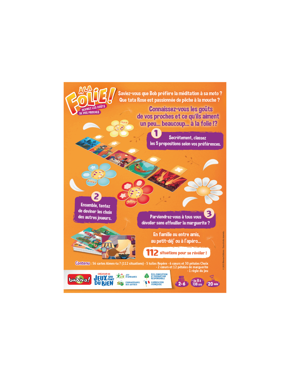 Au milieu de la table se trouvent 5 cartes « Aimes-tu ? ». Chaque joueur classe secrètement les cinq propositions selon ses préférences. Ensemble, les joueurs tentent de deviner les choix des autres joueurs. Attention ! Pour chaque mauvaise réponse, un pétale de la marguerite À la folie est retiré. Les joueurs perdent la partie si tous les pétales ont été retirés avant qu’ils n’aient révélé l’ensemble de leurs choix. Ils gagnent la partie, tous ensemble, si tous les joueurs révèlent leurs préférences !