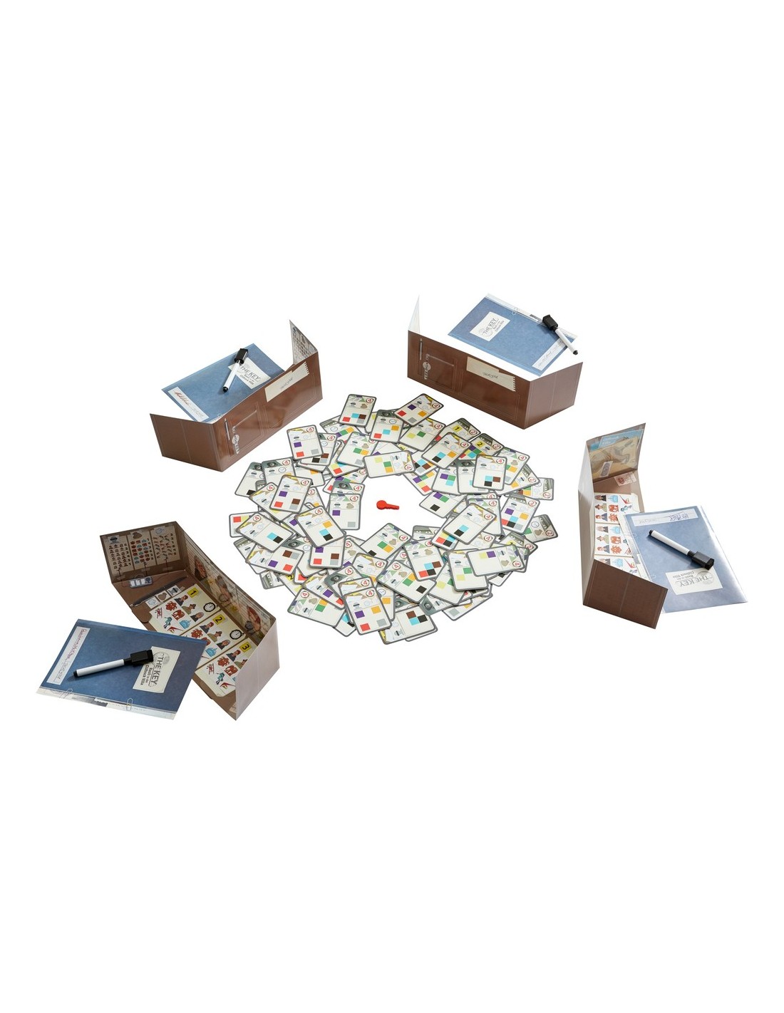 4 porte-documents paravents, 4 feutres avec une petite éponge,4 dossiers d’enquête,9 clés en bois,1 carton de solutions,140 cartes : 72 cartes « témoignage » et 68 cartes « laboratoire » (20 cartes « empreinte digitale », 24 cartes « pièce à conviction », 24 cartes « vidéosurveillance »),1 règle du jeu.