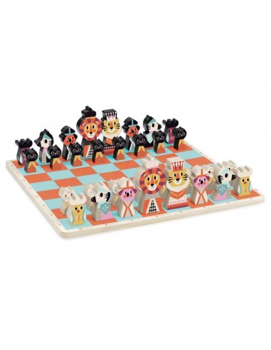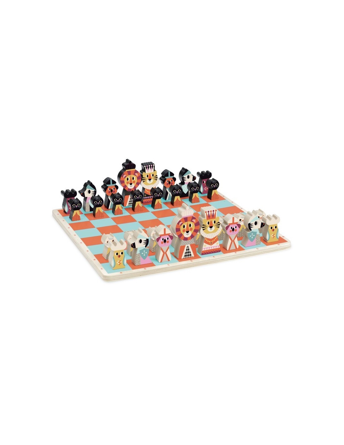 Échiquier animaux en bois pour enfant illustré par Ingela P. Arrhenius.