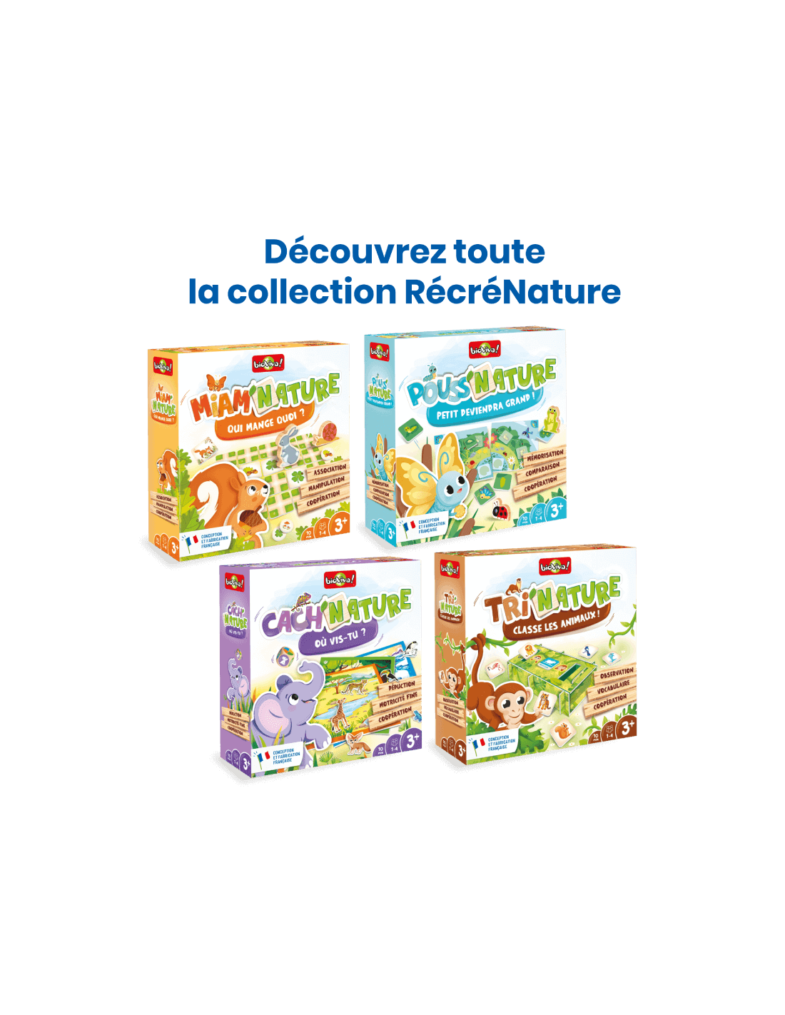 La collection « RécréNature » de Bioviva contient 4 jeux d’apprentissages simples et évolutifs (avec deux niveaux de règles) pour accompagner les enfants, dès 3 ans, dans leur découverte du monde vivant. Dans les jeux coopératifs « Miam’Nature », « Tri’Nature », « Pouss’Nature » et « Cach’Nature », tout le monde gagne ou perd ensemble. Une façon ludique et originale pour découvrir ses capacités d’entraide ! Chaque jeu peut également être joué en toute autonomie avec un système d’auto-correction permettant à l’enfant de vérifier ses réponses.