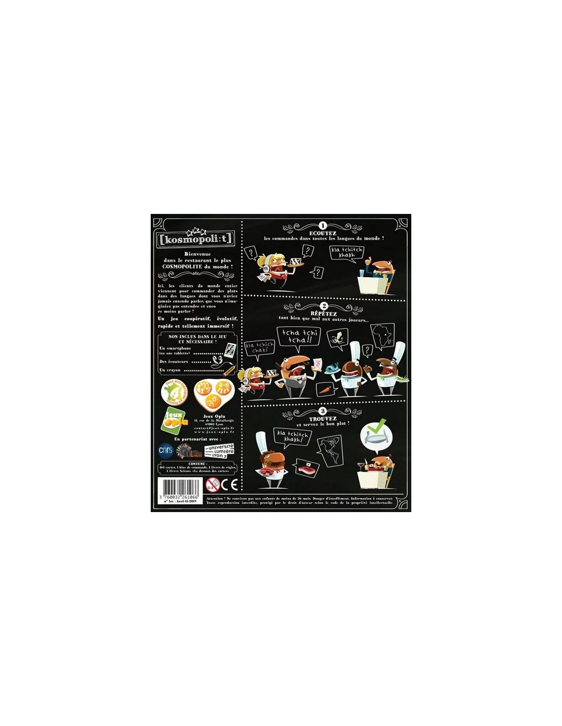 [kosmopoliːt] se joue de 4 à 8 joueurs parmi lesquels il y a toujours une Serveuse, un Maître d’Hôtel et des Cuistots. La Serveuse gèrera la salle de restaurant sur l’appli. elle aura ses écouteurs sur les oreilles et pourra prendre les commandes des clients qu’elle transmettra aux Cuistots et surtout au Maître d’Hôtel. Sauf que nos clients viennent du monde entier, et souhaitent déguster des plats typiques qu’ils demandent dans l’une de leurs 60 langues natives !