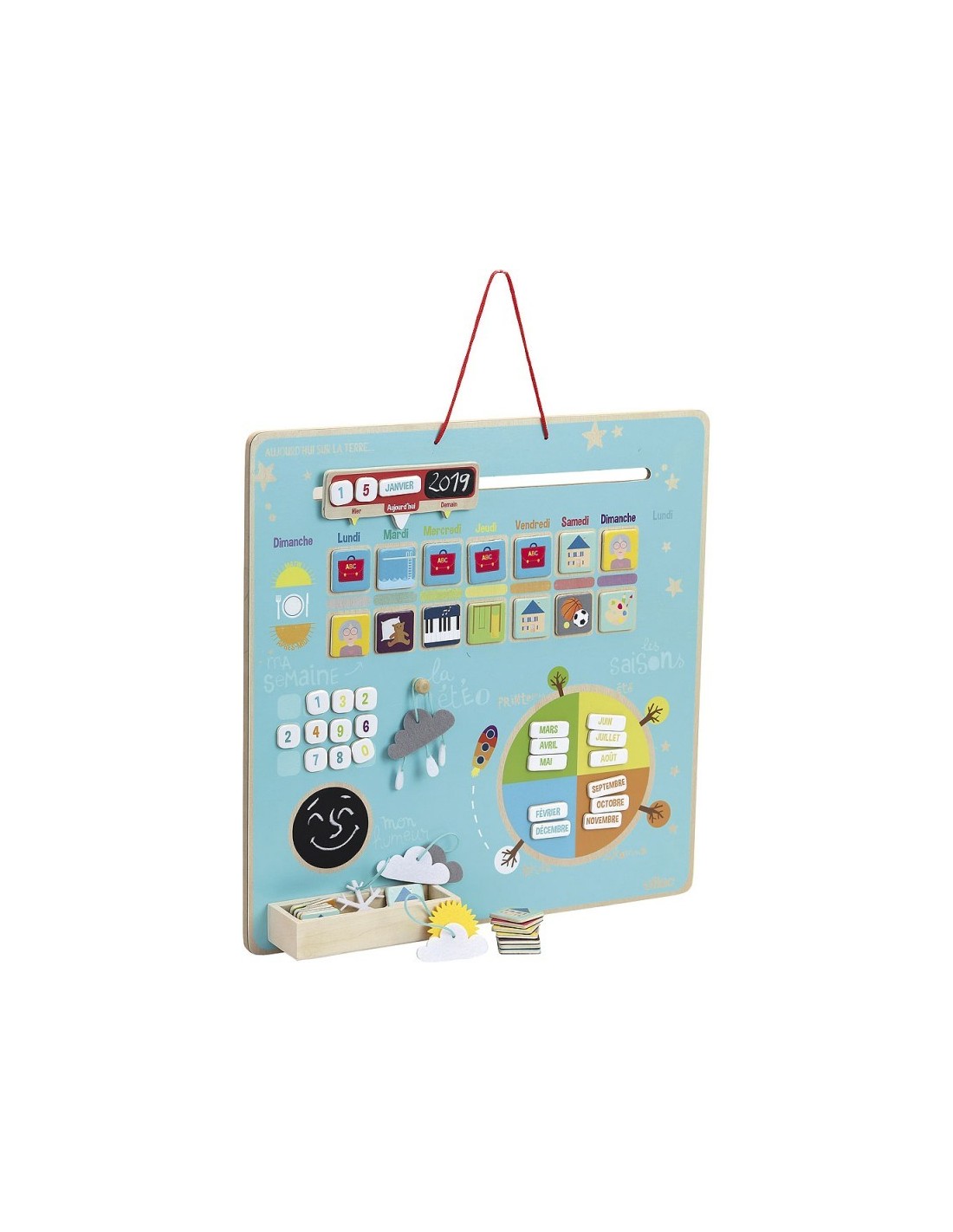 Un magnifique semainier en bois magnétique pour apprendre à découvrir les jours, les dates, les mois, les saisons, la météo… Aujourd'hui j'ai piscine ? Je déjeune à la cantine ? Livré avec plein d'accessoires et une craie pour dessiner son humeur ! Semainier en bois à suspendre, 38 cm de côtés. A partir de 3 ans.