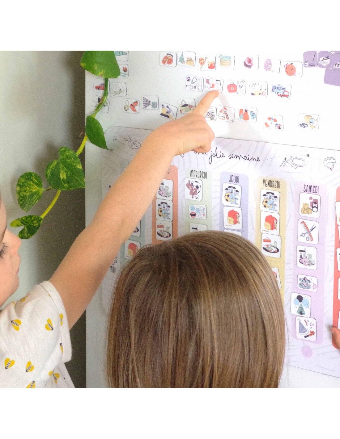 Le manque de repères dans le temps favorise le stress et l’anxiété des plus petits. On l’observe notamment lors des séparations (école, nourrice…) ou lorsque les emplois du temps sont bouleversés (changement de situation familiale, activité de dernière minute…). Visualiser le déroulé de la semaine permet à votre enfant de pouvoir appréhender les évènements qu’il va vivre. Il peut ainsi se repérer dans le temps à travers ses activités quotidiennes( « est-ce qu’ il y a école demain ?», « où est-ce que je mange ce midi ?»).