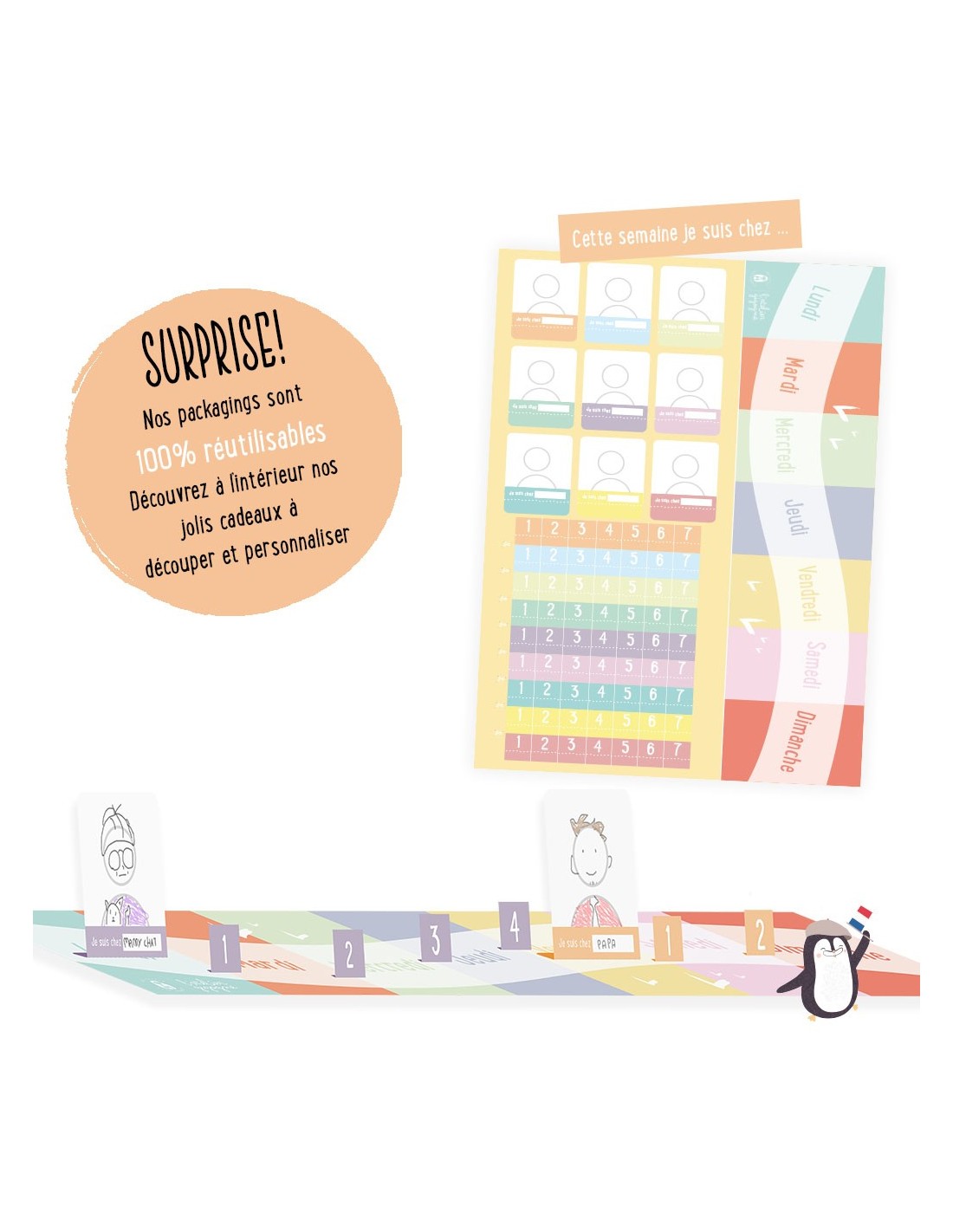 Le packaging est 100% réutilisable. A l’intérieur se trouve un petit cadeau à découper et personnaliser. Parents séparés ou « dodos » hors du foyer, vos enfants seront ravis de l’utiliser. En plus d’être très utile et éco-conçu, l’outil « ma jolie semaine » est 100% français !