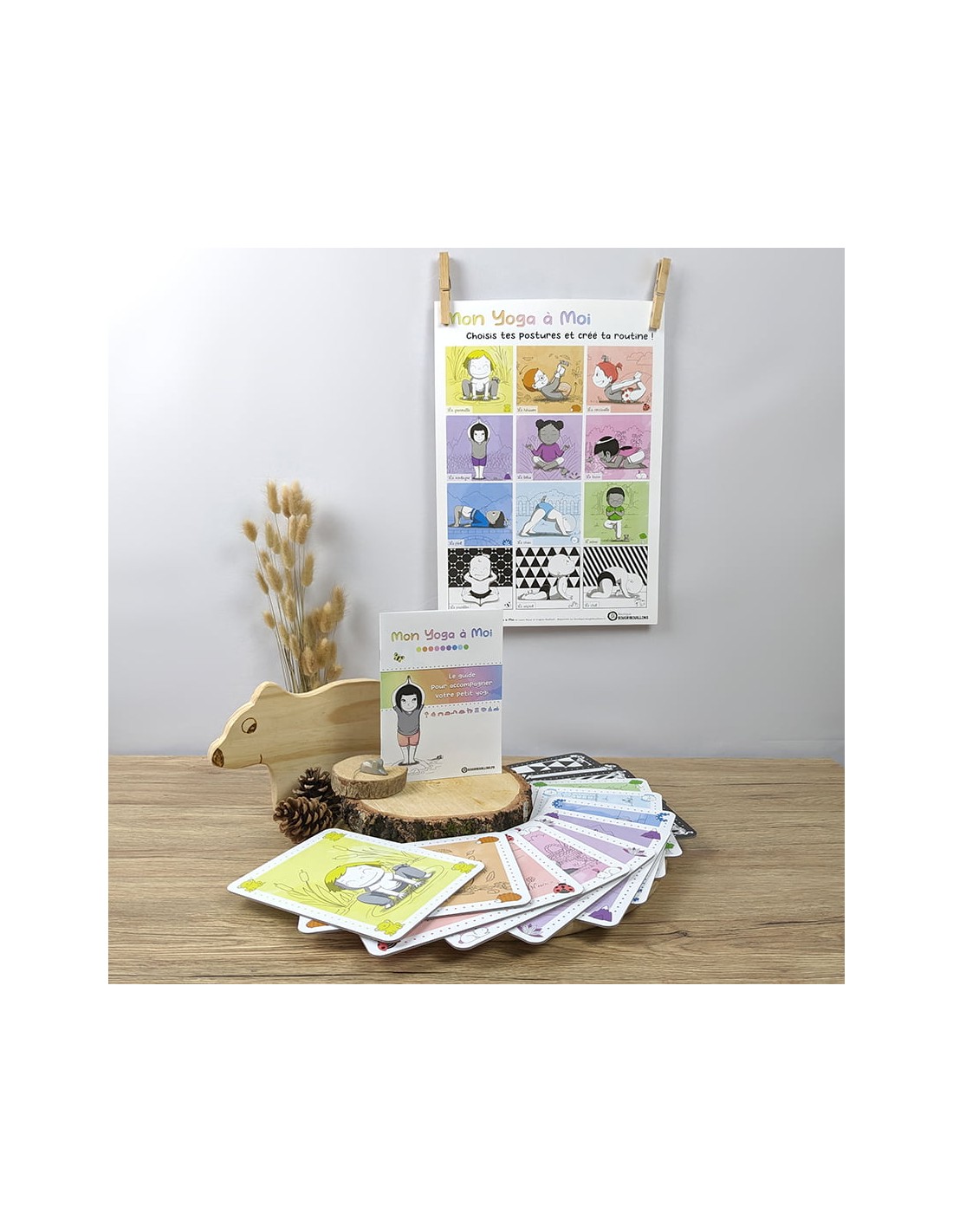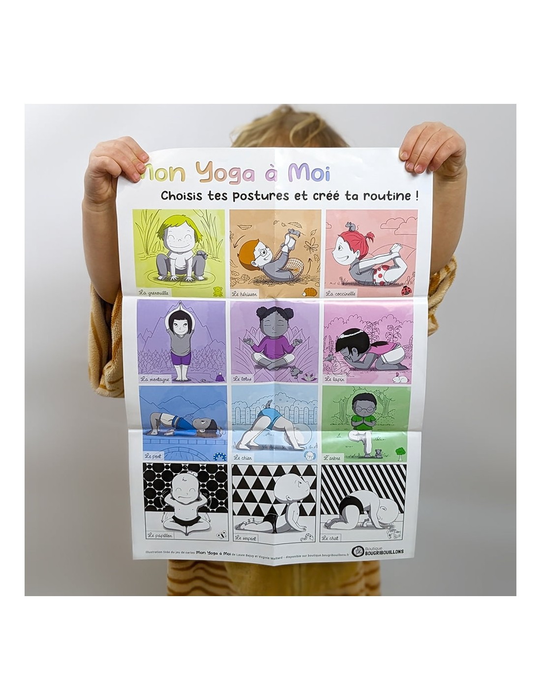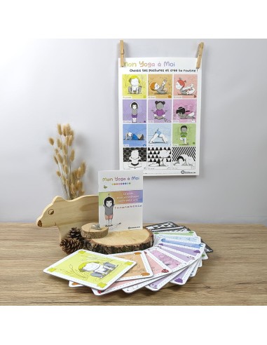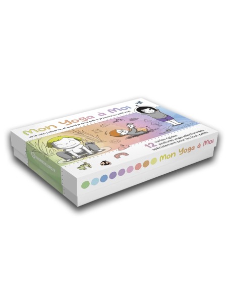 Une boîte de 12 grandes cartes solides proposant des postures yoga adaptées aux tout-petits, avec en cadeau, un poster des 12 postures, un guide pour accompagner votre enfant dans la découverte du yoga.