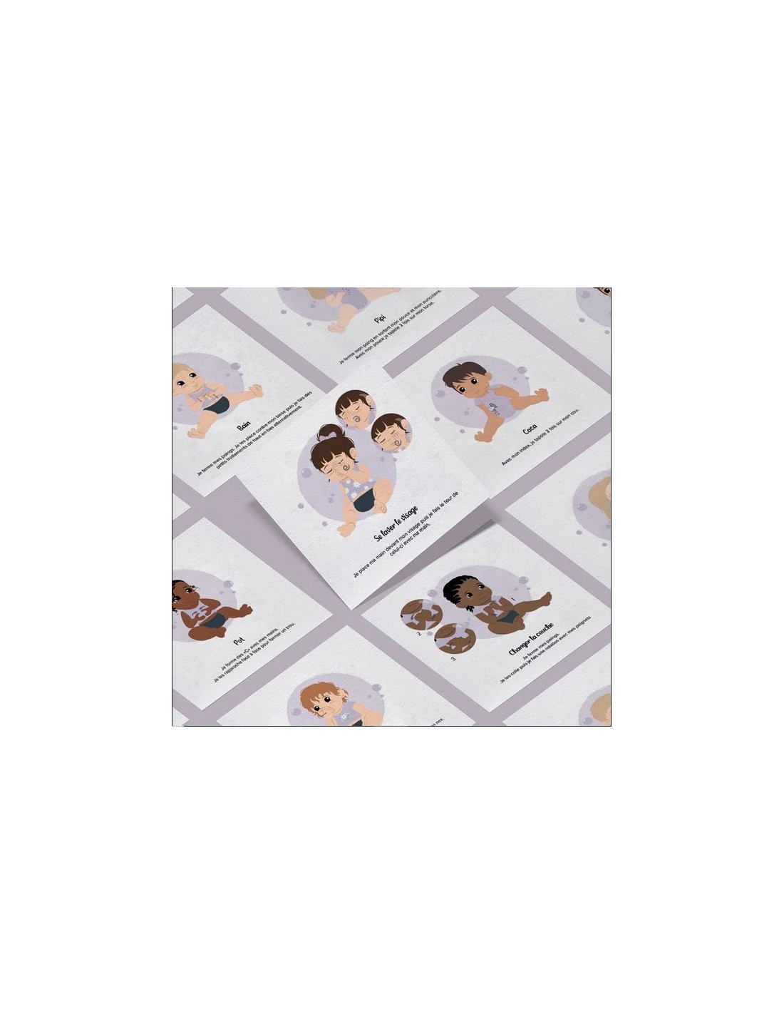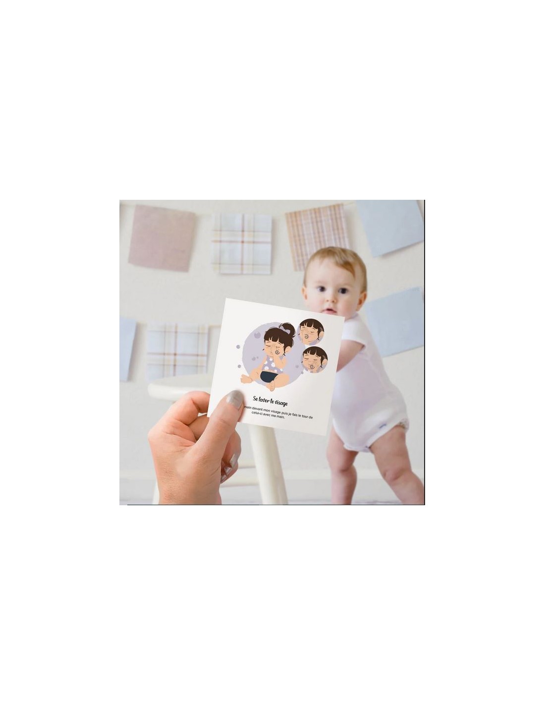 Les jolies illustrations peuvent s’afficher partout : chambre, table à langer, cuisine, de façon à pouvoir les répéter quotidiennement.