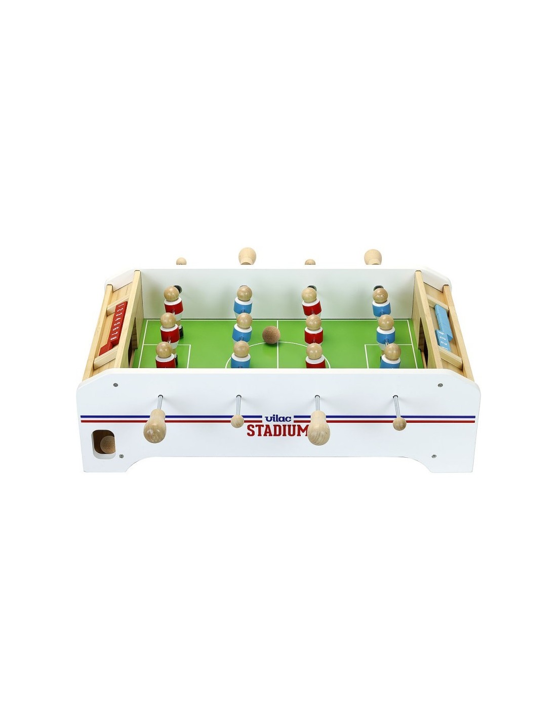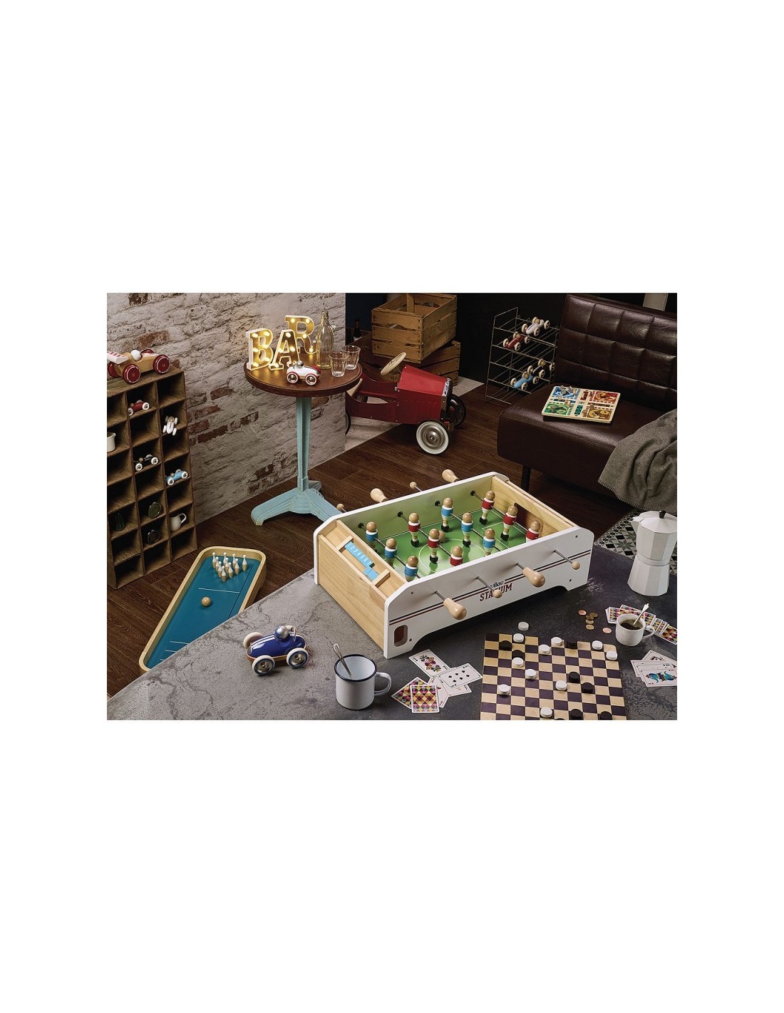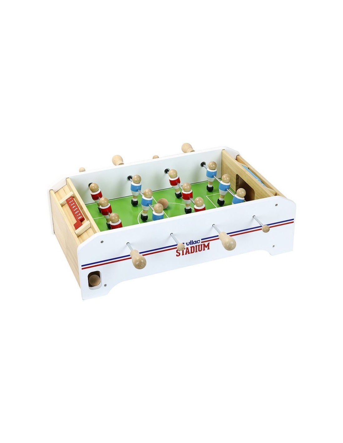 Joli petit babyfoot de table, à poser pour des parties de folie ! Babyfoot en bois 12 joueurs et 3 balles en liège, avec un compteur de points pour chaque équipe. À partir de 4 ans.