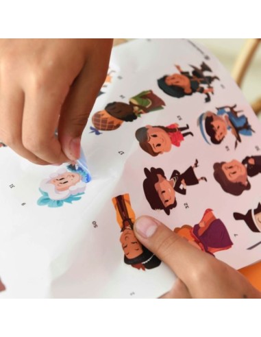 Pour coller les autocollants, l’enfant observe les silhouettes des dessins et les numéros indiqués.