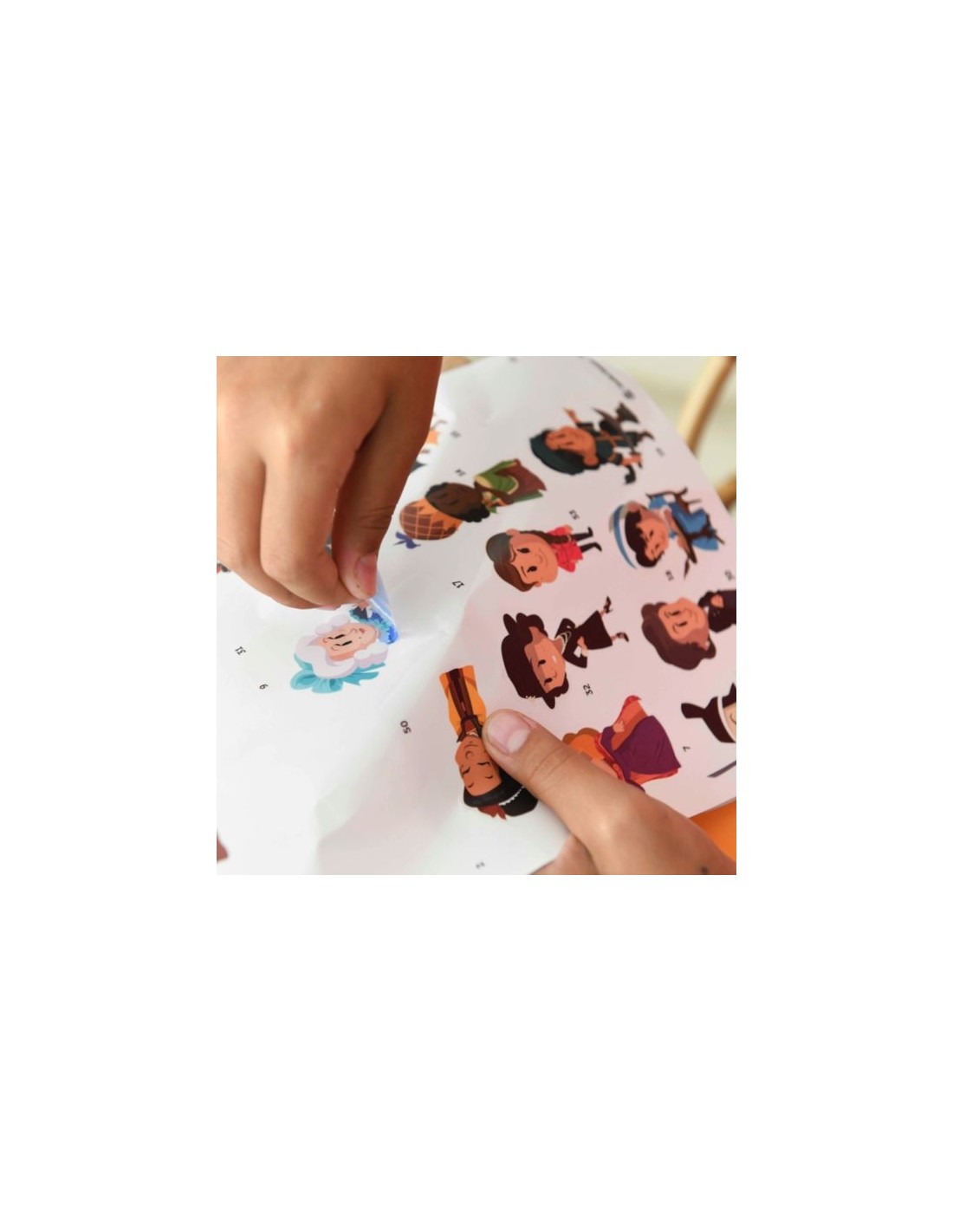 Dépliez le poster Femmes célèbres. Effacez les plis au maximum en pliant dans le sens inverse. Placez le poster bien à plat, sur une table ou sur le sol, et commencez à coller les autocollants en observant les silhouettes. Un peu comme un coloriage géant ou comme un grand puzzle, le poster se couvre de dessins et de couleurs.