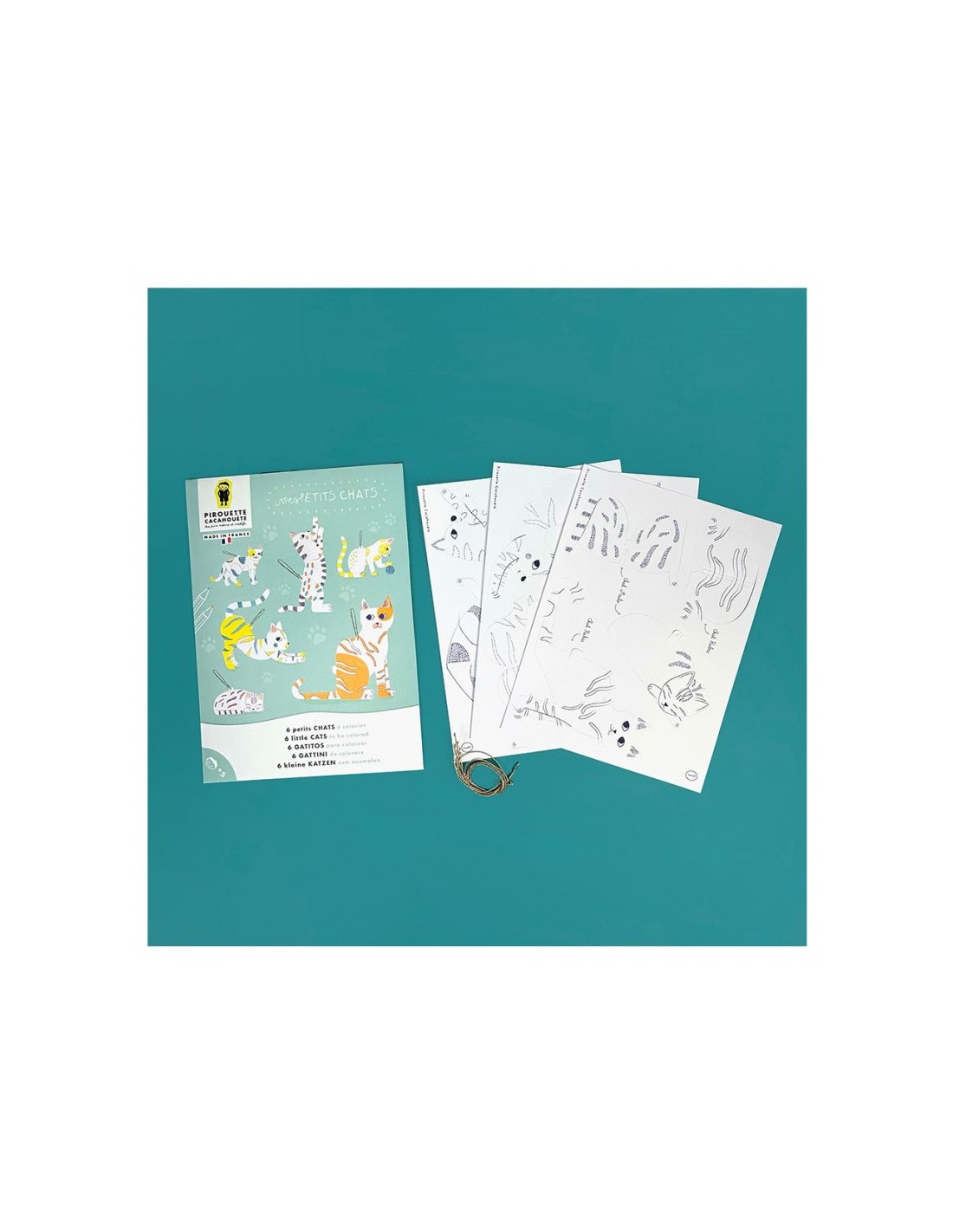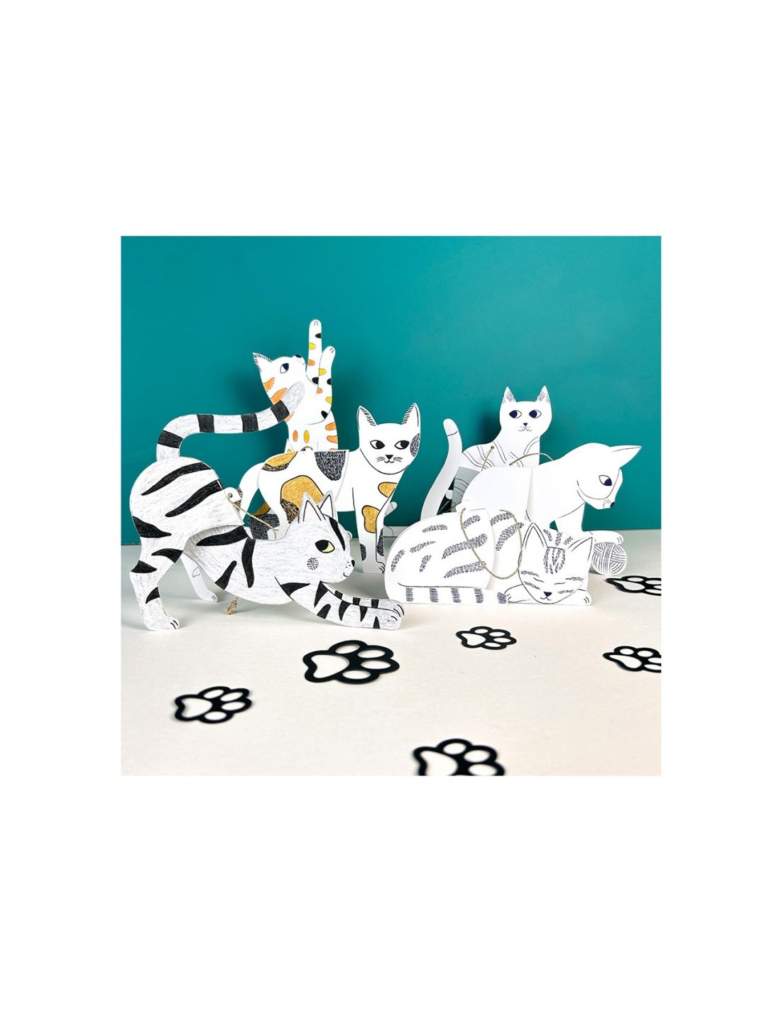 À l’intérieur, vous trouverez 6 adorables chats en papier cartonné à créer et à colorier :