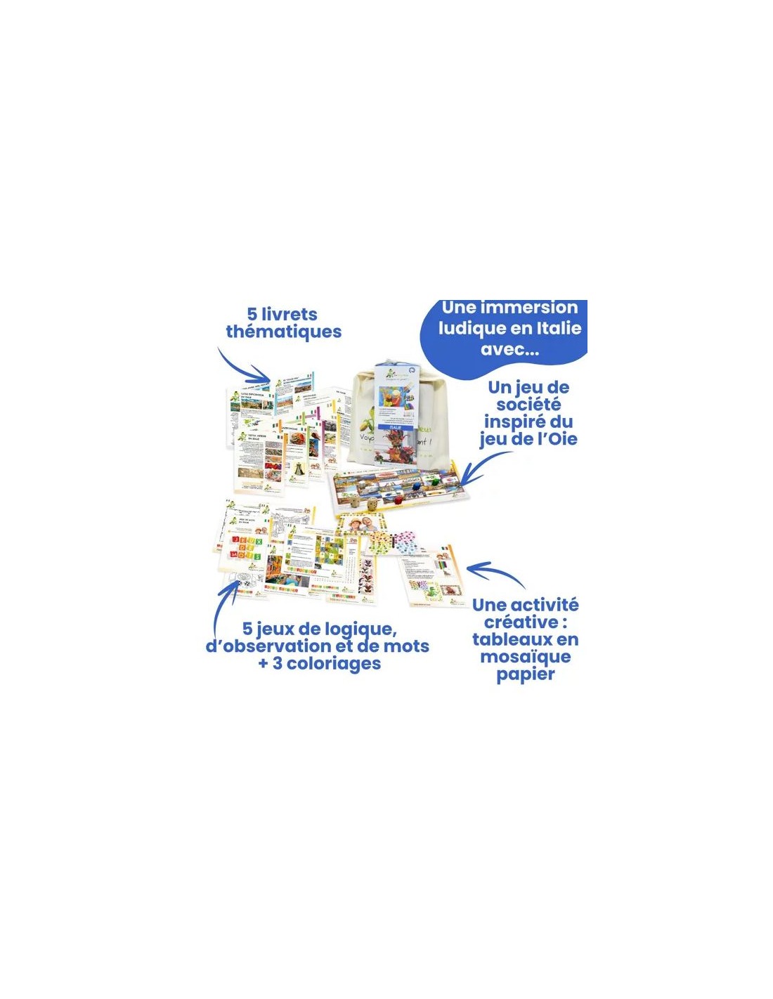 Ce kit complet est une immersion ludique en Italie pour découvrir ses paysages, son histoire, sa culture très riche et son art de vivre si typique.