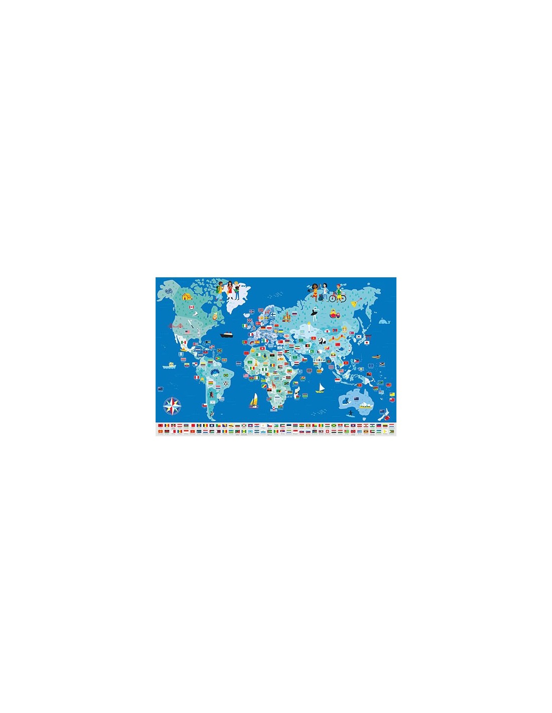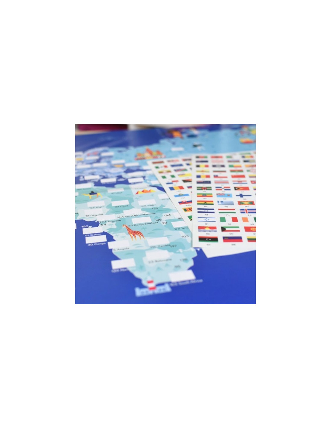 – Ce planisphère pour enfants doit être complété avec les stickers des 197 drapeaux du monde.