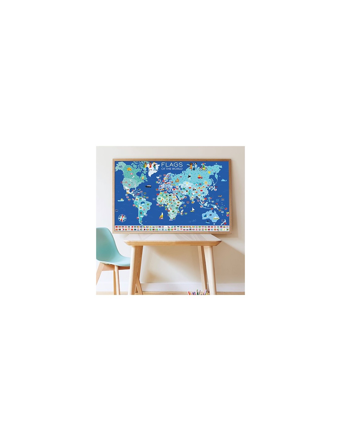 – Vous pouvez aussi encadrer le poster des drapeaux du monde, pour un résultat encore plus bluffant. Pour cela, choisissez un cadre standard 100 x 70 cm.
