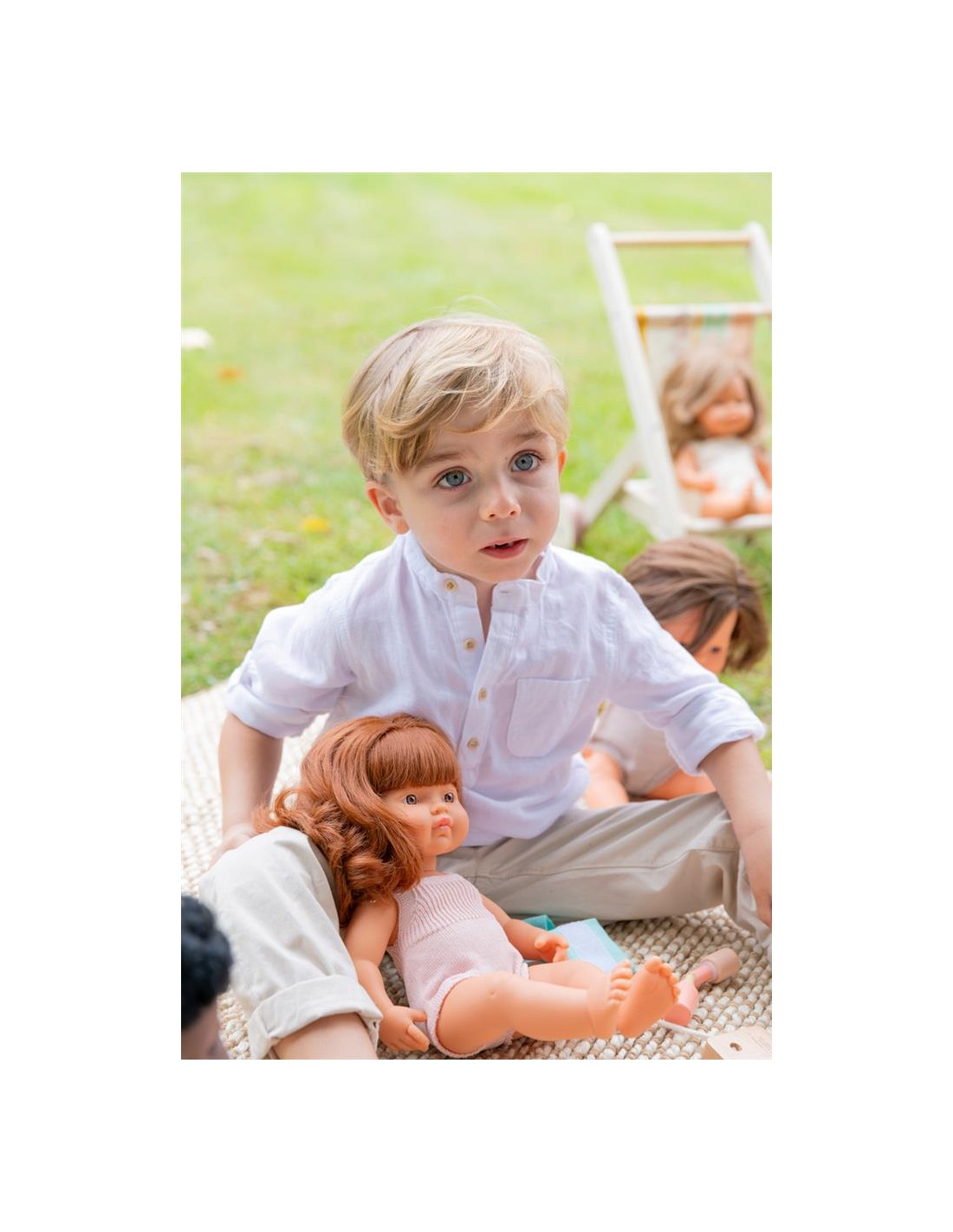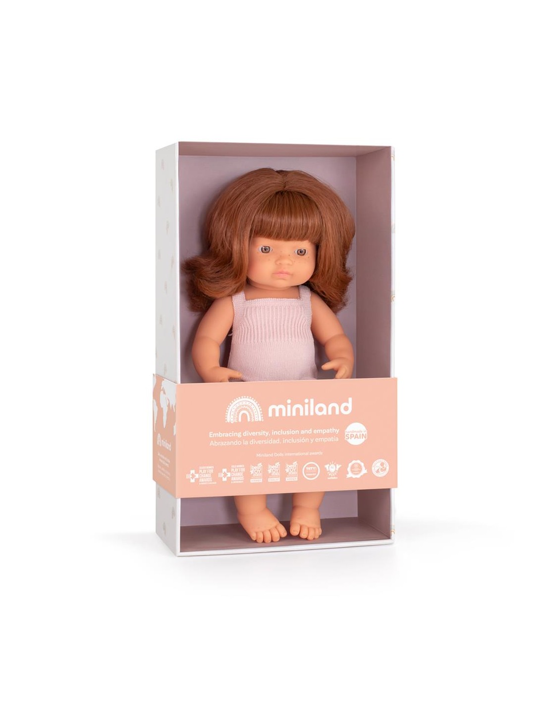 Poupée de Miniland avec des traits représentatifs caucasiques avec des cheveux roux et des yeux bruns. Cette poupée fait partie de la collection Miniland Dolls, qui promeut des valeurs d'égalité entre garçons et filles, quels que soient leur origine, leur sexe ou leur condition et leur permet de devenir sensibles à la diversité, ainsi que de développer des compétences sociales telles que l'empathie et la tolérance.