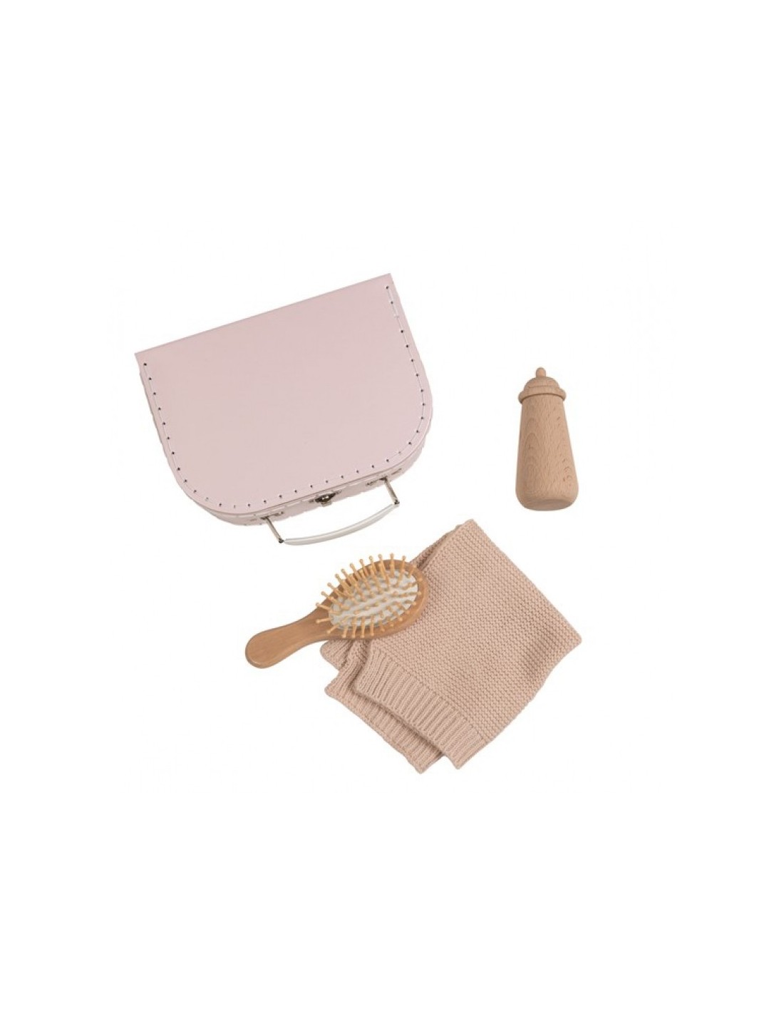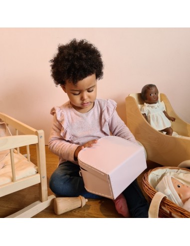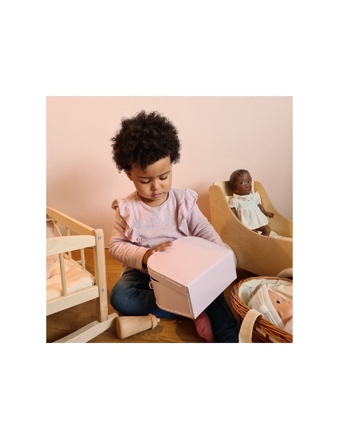 Cette petite valise en carton rose nacré contient un biberon et une brosse à cheveux en bois ainsi qu'une petite couverture de coton tricoté pour bien soigner les poupées ! La valise est cousue main.