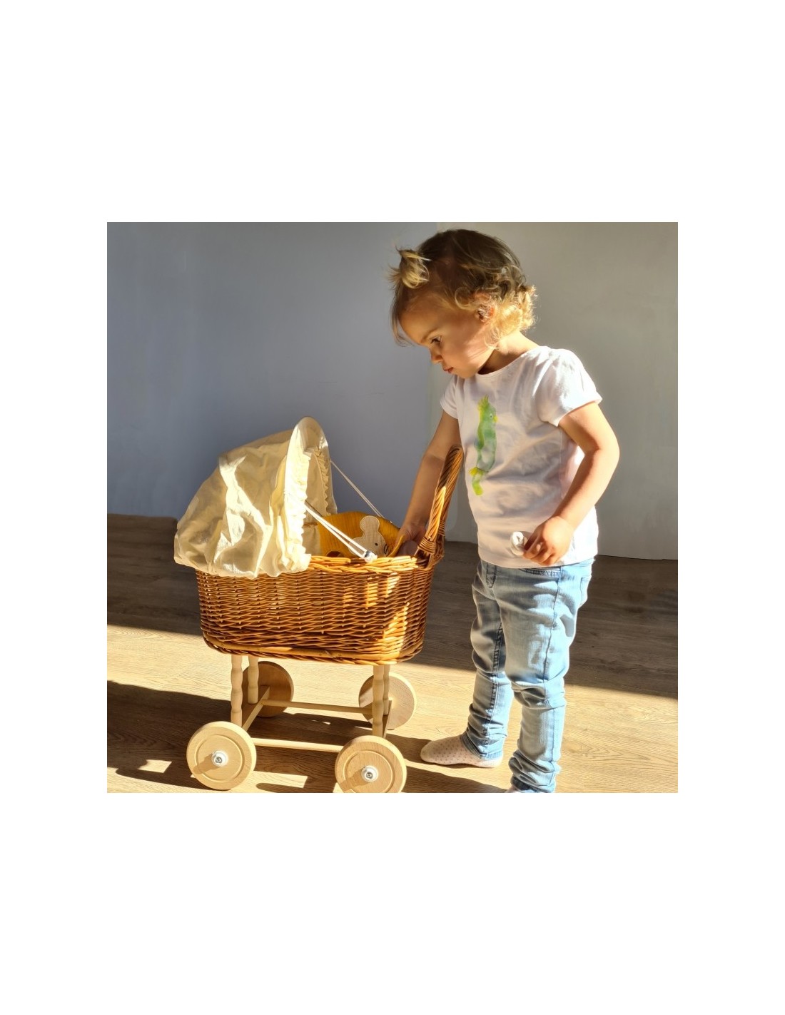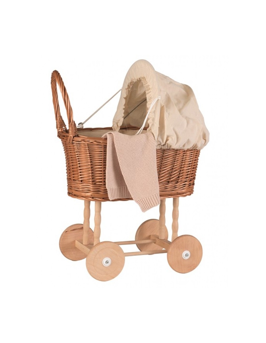 Ce landau est parfait pour emmener les poupées ou les ours en peluche en promenade. En osier naturel, il est garni d'un tissu et d'une petite couverture en coton tricoté blanc cassé.