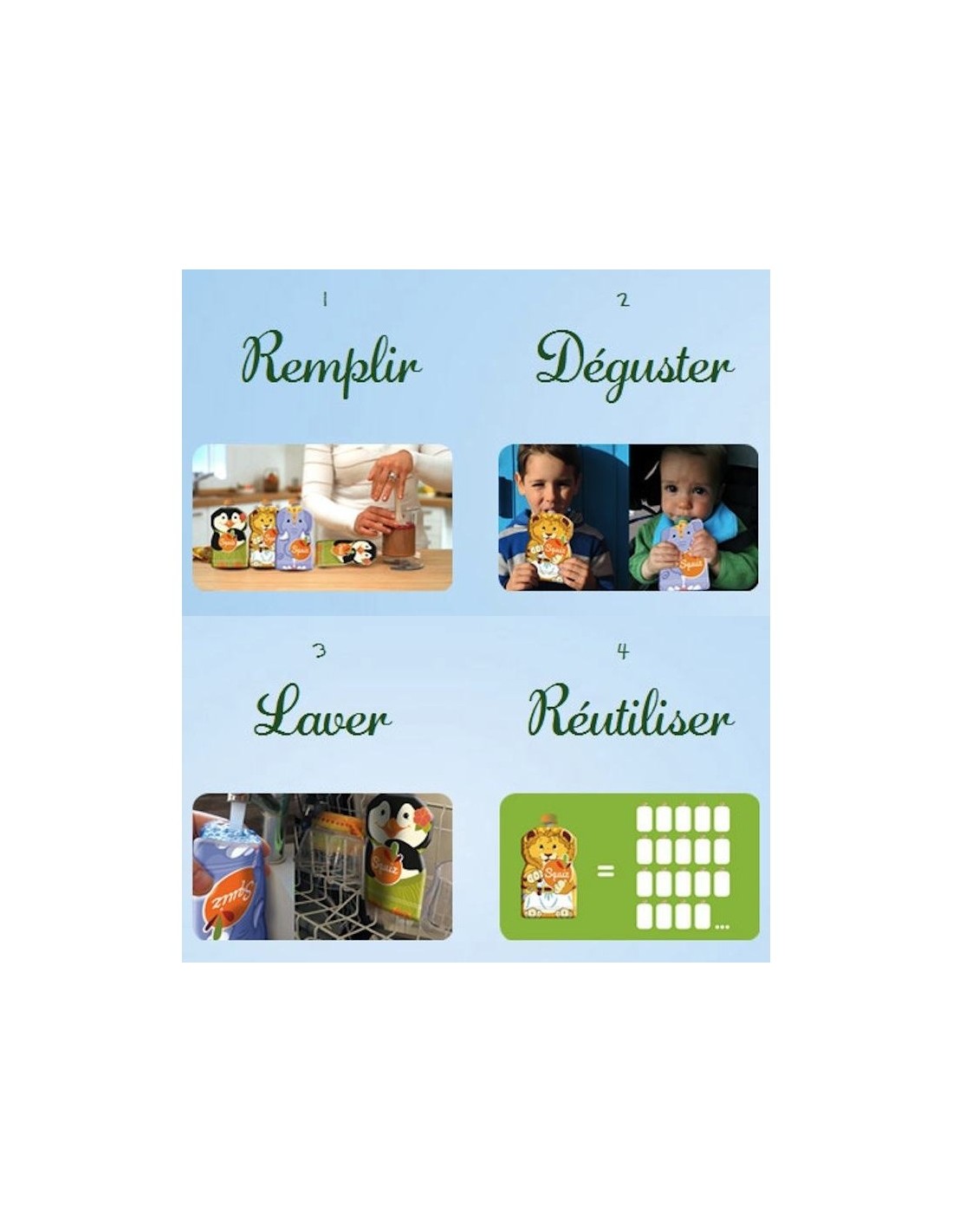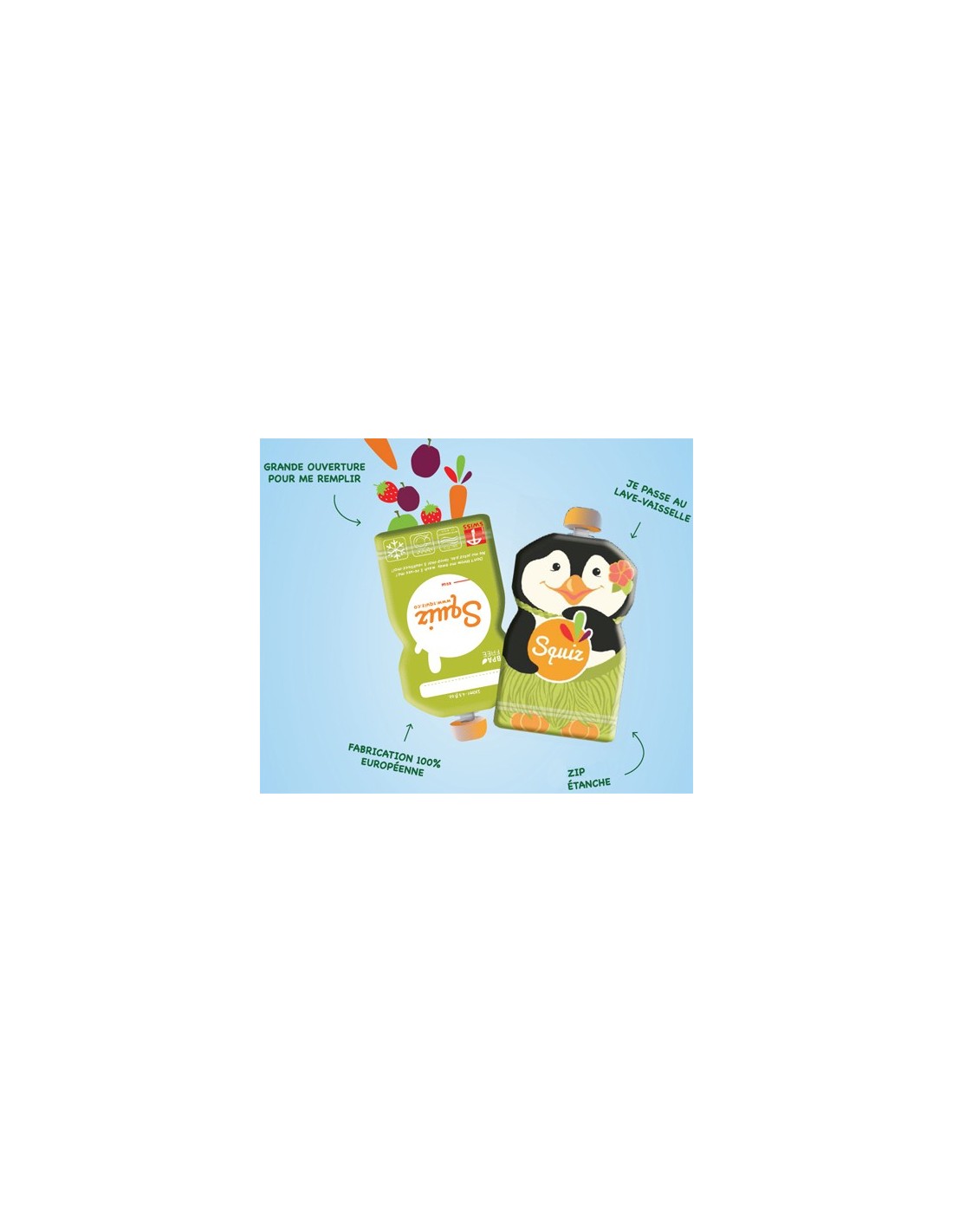 La gourde souple réutilisable est une révolution dans le monde de l'alimentation des petits. Avec SQUIZ, première marque française de fabrication 100 % européenne créée par une sage-femme et mère de 5 enfants, les parents français peuvent enfin en profiter ! Pratique, écolo, saine, ludique et économique, elle permet d'emporter partout les repas des bébés et les encas des plus grands : purées de légumes, compotes de fruits, yaourts à boire, smoothies, votre imagination culinaire est sa seule limite. Et grâce à SQUIZ, fini le gaspillage des emballages ! Facile à remplir, transporter, laver et re-remplir à l'envi, SQUIZ fait le bonheur des enfants, des parents... et de la planète. Pour maximiser la durée de vie de vos SQUIZ, il est préférable de les laver à la main avec un goupillon.