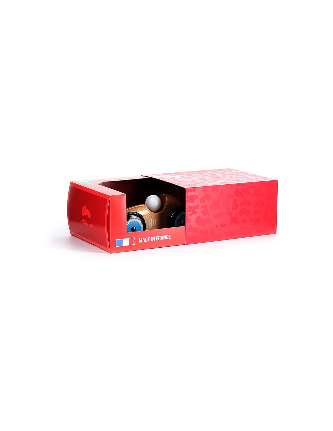 Ce cabriolet XL, disponible en plusieurs coloris, a été conçu et fabriqué dans l'atelier Vilac à Moirans en Montagne (Jura), à partir de bois de hêtre issu de forêts gérées durablement. Chaque petite voiture estampillée fabrication française a été décorée avec de la laque brillante, inoffensive pour les enfants.